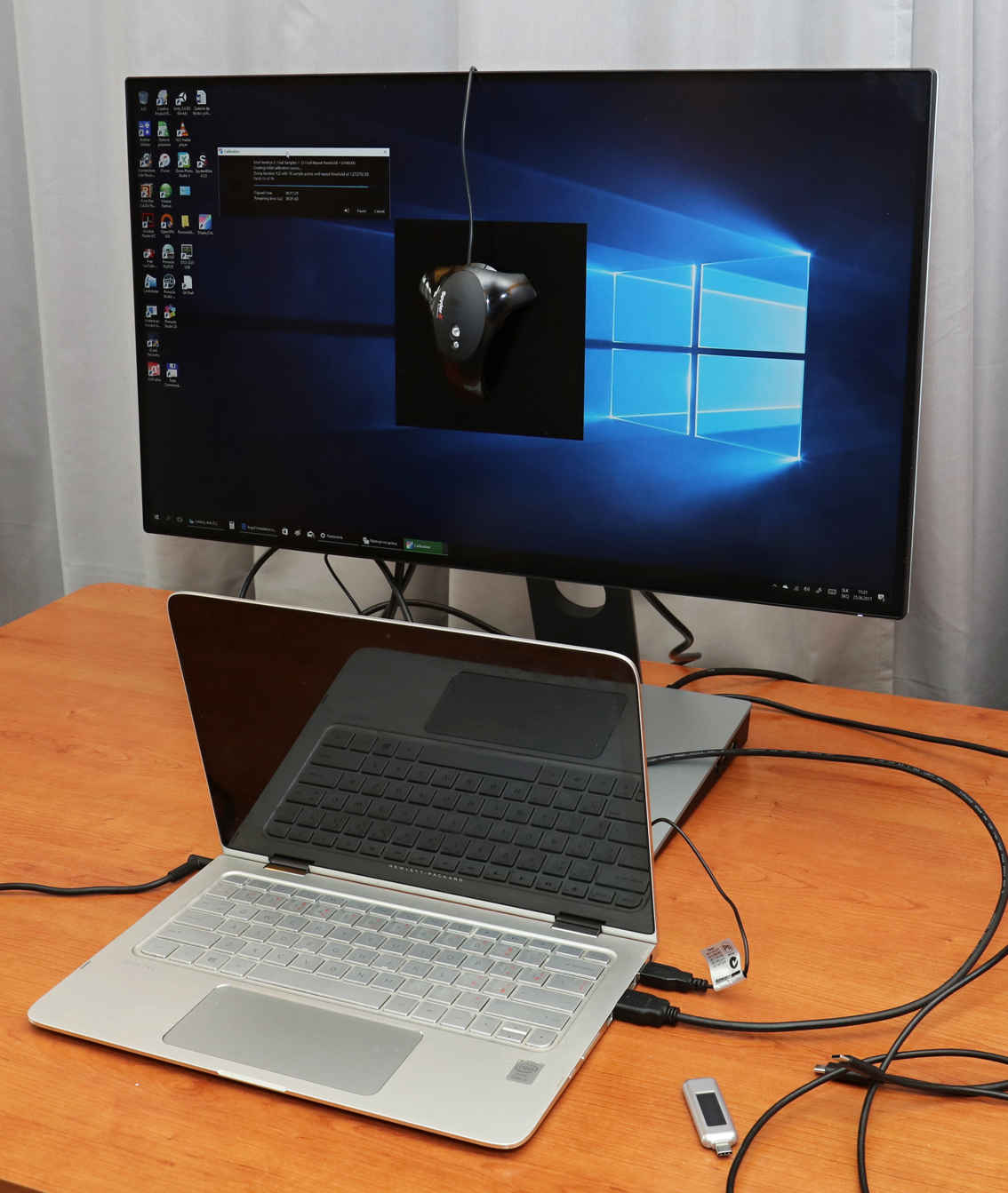 Meranie pomocou sondy Spyder 4 Elite. Všimnite si na stole vpravo od notebooku prípravok na meranie napätia a prúdu pri napájaní a nabíjaní cez USB-C. Výsledky merania sú vo videu.