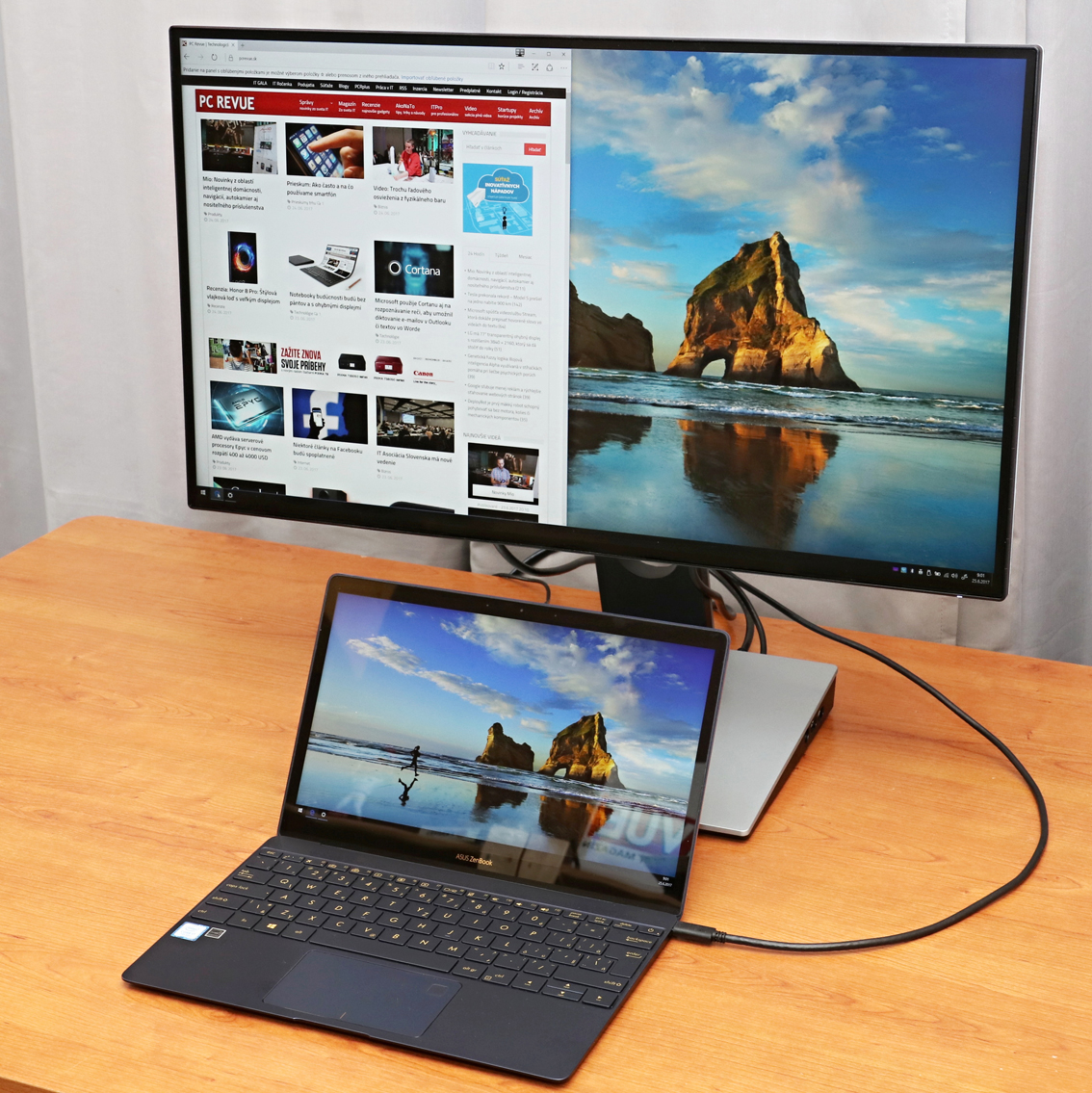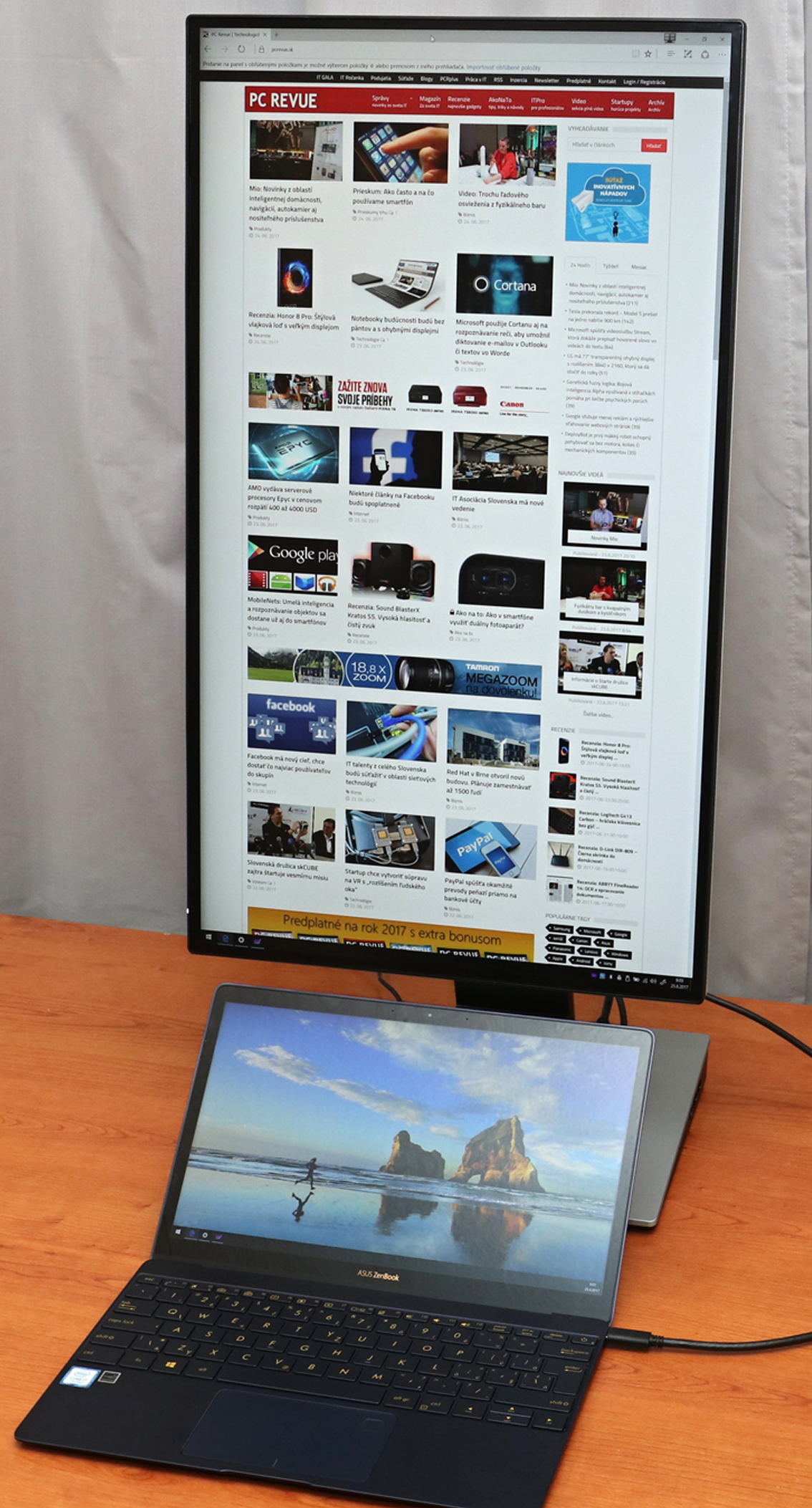 Najzaujímavejšiu črtu – dokovaciu stanicu – som si nechal na záver. Práve vďaka nej je monitor úplne pripravený na štandard USB-C, takže jeho používateľ nebude mať žiadny problém ani v prípade, ak si v budúcnosti kúpi ultrabook, ktorý bude mať len jeden takýto port. Stačí prepojiť notebook s dokovacou stanicou dodaným káblom USB-C. Port s podporou rozhrania Thunderbolt 3 zabezpečí nielen prenos obrazu, ale aj napájanie a možnosť pripojenia až štyroch periférnych zariadení cez klasické porty USB 3.1, pričom každý port má dostatočnú výkonovú rezervu na napájanie pripojeného zariadenia. Na testovanie sme použili ultrabook ASUS ZenBook 3 UX390 s jediným USB-C portom