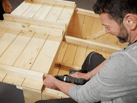 - Vyznačte otvory na vŕtanie a zostavte rámovú konštrukciu z narezaných dielov. Bočné rámy spojte pomocou aku vŕtacím skrutkovačom PARKSIDE (PABS 20‑Li G8). Následne jednotlivé rámy obložte vonkajšími doskami. Skôr než ich pritiahnete skrutkami, vložte na dno konštrukcie podlahu.