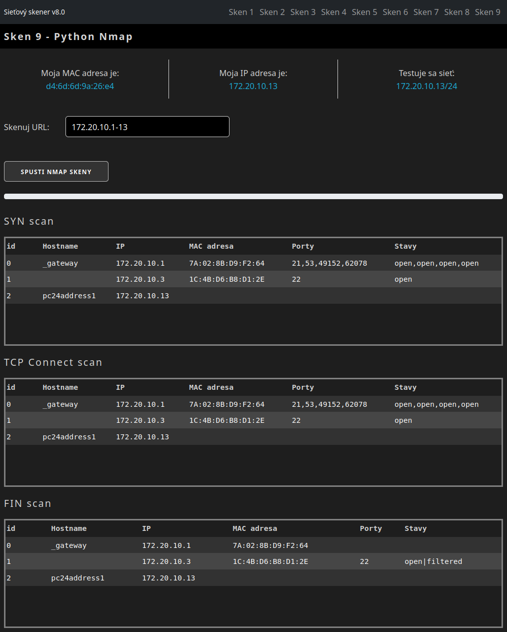 Obsah tabuliek, resp. stránky je automaticky obnovovaný, to značí, že používateľ po stlačení tlačidla nemusí vykonať žiadnu ďalšiu činnosť a už iba sleduje výstup bežiacich skenov. V programovom kóde absentuje detekcia chybových stavov a výnimiek. Kód sme v maximálnej miere zjednodušili s cieľom prezentovať, akým spôsobom možno v rámci programového kódu napísaného v jazyku Python vykonať príkazy nástroja Nmap. Využili sme pri tom metódy konkrétnej triedy nmap3.NmapScanTechniques(), ktoré generovali už spomínané argumenty príkazov nmap a po ich vykonaní pripravili výstup vo forme slovníkov Python, ich podslovníkov a zoznamov. Potom nám už nič nebránilo prečítať uvedené slovníky a zoznamy, presunúť požadované údaje do DataFrame a ich obsah zobraziť v príslušných tabuľkách v rámci webového prostredia.