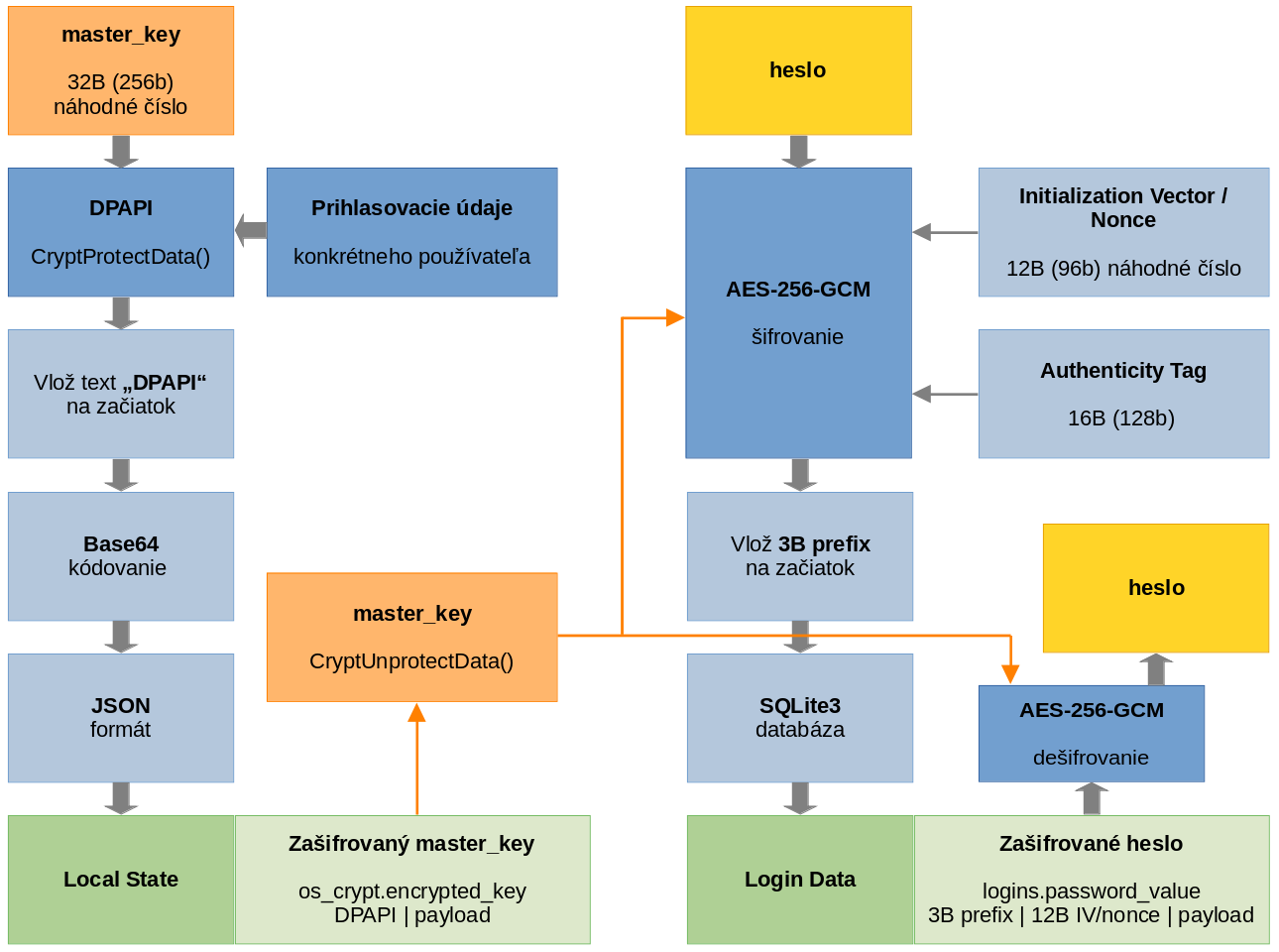 Celý problém s ukladaním prihlasovacích údajov spôsobuje tzv. master_key (pozri obr. 1). Ide o 32B náhodné číslo vygenerované prehliadačom Chrome, ktoré je zašifrované pomocou funkcie DPAPI CryptProtectData() s využitím prihlasovacích údajov konkrétneho používateľa. Následne je pred zašifrovaný master_key pridaný text „DPAPI“, celý objekt je zakódovaný kódovaním Base64 a vo formáte JSON uložený do súboru USER\AppData\Local\Google\Chrome\User Data\Local State, kde USER je domovská zložka používateľa. Jedinou podmienkou na dešifrovanie master_key je teda byť prihlásený do OS, nič viac.