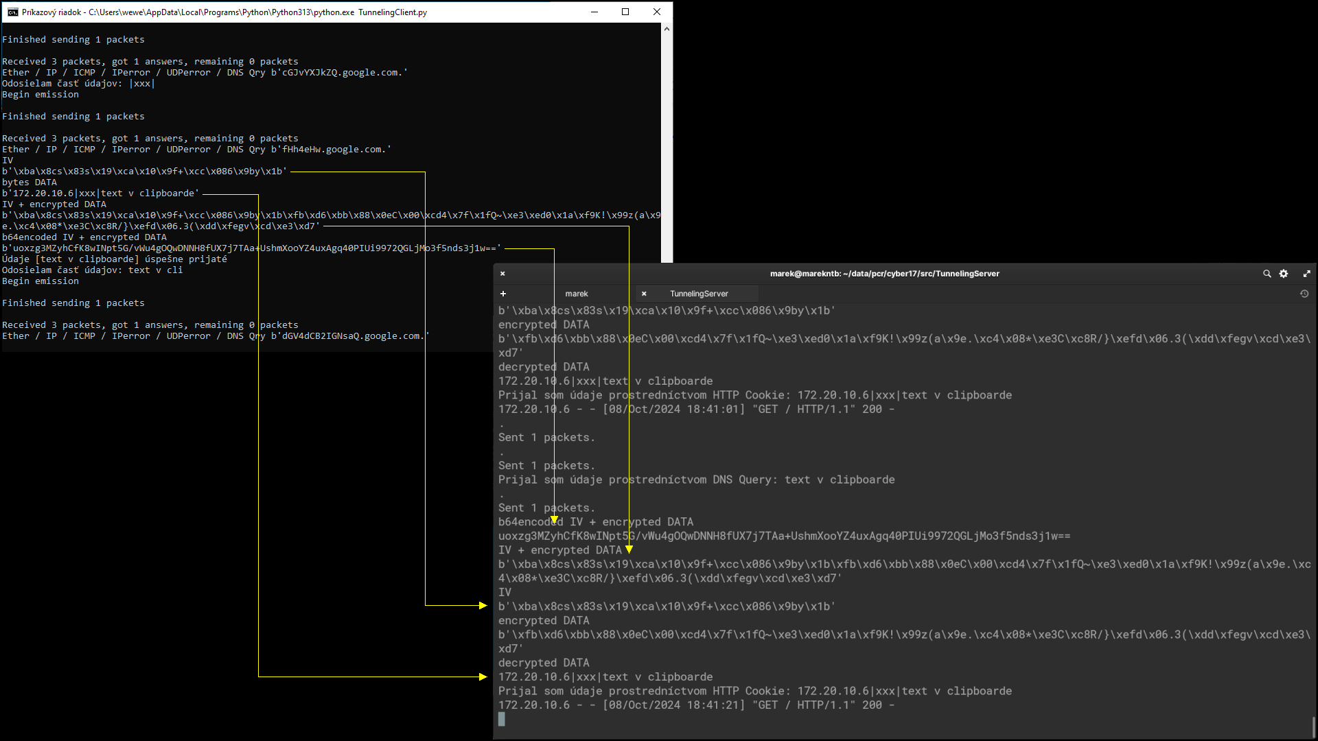 Na začiatku súboru page6.py, ktorý je súčasťou aplikácie Dash a vykonáva sa na strane servera, takisto importujeme modul Crypto.Cipher.AES a nástroje na zarovnanie údajov Crypto.Util.Padding. Následne definujeme hodnotu toho istého 16-bitového šifrovacieho kľúča, ktorý sme použili na zašifrovanie prenášaných údajov. Ďalej definujeme funkciu decrypt(), v rámci ktorej vytvárame nový objekt – šifru AES, pričom funkcii new() odovzdávame šifrovací kľúč, nastavujeme šifrovací mód (CBC) a odovzdávame ten istý inicializačný vektor, ktorý sme vygenerovali v rámci súboru TunnelingClient.py (pozri postup uvedený ďalej). Potom funkciou cipher.decrypt() dešifrujeme údaje a pomocou funkcie unpad() odstraňujeme zarovnanie. Algoritmus dešifrovania prijatých údajov je obsahom funkcie myRequestHandler(), kde po príjme údajov postupujeme takto: