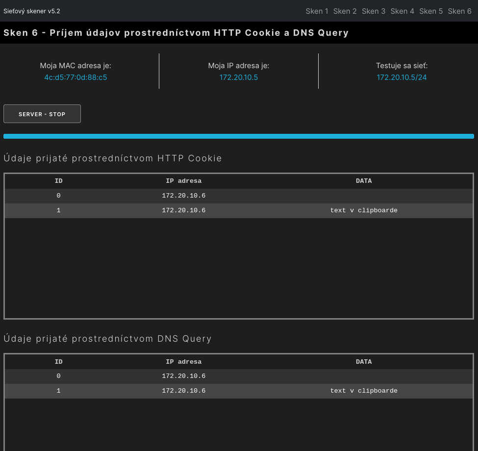 5. v prípade DNS v rámci funkcie getDNSdata() získame obsah DNS Query, ten dešifrujeme s využitím rovnakého IV ako v predošlom prípade (2. bod) a po skompletizovaní celého reťazca ten zobrazujeme v príslušnej tabuľke aplikácie Dash.