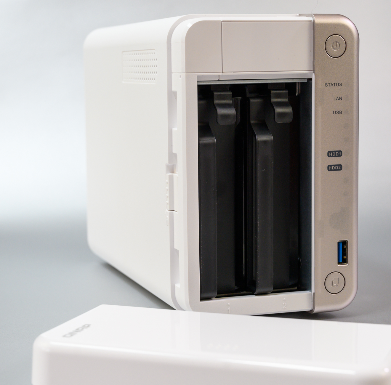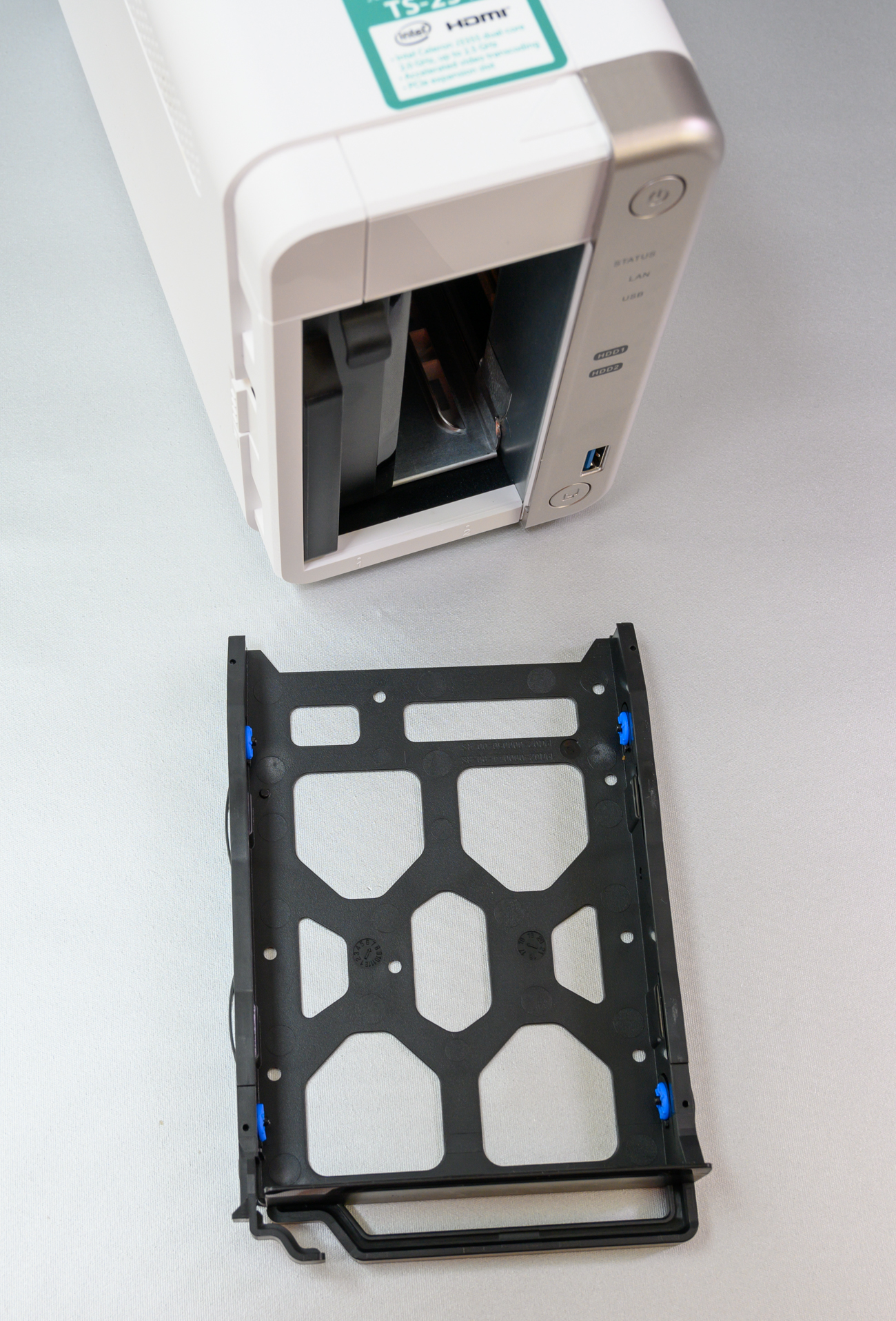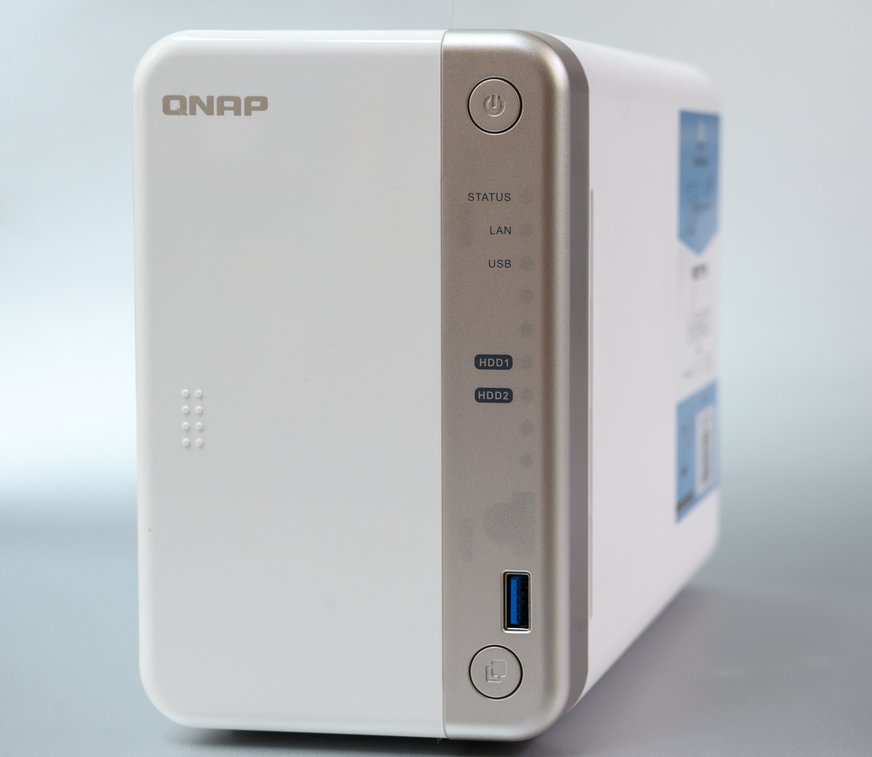 QNAP TS-251B je vybavený dvoma šachtami na 3,5 palcové disky, do ktorých sa dajú upevniť aj menšie 2,5 palcové disky. Skrinka zariadenia je z bieleho plastu s elegantne zaoblenými hranami, takže sa dá jednoducho zakomponovať do interiéru izby, kancelárie, či ateliéru. Dominantným dizajnovým prvkom predného panelu je zvislá plocha s metalickou povrchovou úpravou v ktorej sú zakomponované dva tlačidlá – jedno na zapnutie a vypnutie a druhé na aktivovanie importu údajov z externého disku. Nad tlačidlom je USB port USB 3.0 na jednoduché pripojenie USB kľúčov a diskov a indikačné diódy. Po odblokovaní posuvného zámku na bočnej stene sa dá biela časť predného panelu odsunúť, čím získate prístup k šachtám. Kryt je fixovaný pomocou magnetov. Disky sa do rámov upevňujú pomocou líšt, takže na ich inštaláciu nepotrebujete žiadny nástroj. Pri diskoch pripomeniem zásadu, že do NAS sa dávajú najkvalitnejšie disky určené na nepretržitú prevádzku napríklad WD série Red, v žiadnom prípade nie disky zo starších PC. Disky pre komerčné zariadenia nie sú dimenzované na niekoľkoročnú nepretržitú prevádzku. Kto investuje do NAS zariadenia, ten pri konkrétnom nasadení očakáva od neho vysokú spoľahlivosť, takže treba použiť nové osvedčené disky konštruované na prevádzku typu 24/7. Pokiaľ plánujete NAS využívať na multimediálne súbory, akceptovateľné sú aj disky, ktoré vám zostali, keď ste ich v novom (!!!) PC, alebo notebooku nahradili rýchlejšími SSD diskami. Ak osadíte SSD disky, budete sa tešiť z vysokých prenosových rýchlostí. Nejde len o zápis a čítanie navonok, ale aj interné prenosy blokov údajov a súborov v rámci RAID a taktiež automatické presuny menej často používaných údajov na pomalšie veľkokapacitné disky. To všetko v réžii operačného systému QTS poskytuje spoľahlivé a škálovateľné úložné riešenie pre profesionálov, hlavne grafikov, dizajnérov, hudobníkov, fotografov, či filmárov