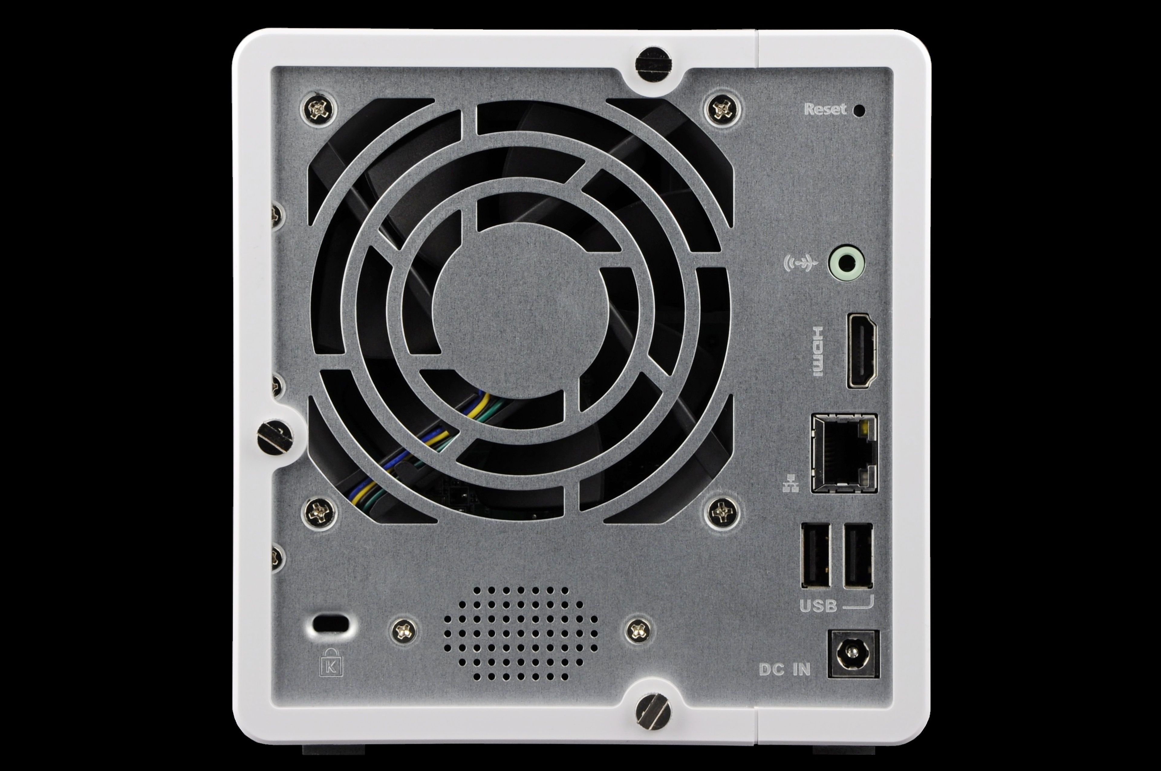 Vzhľad šasi je čistý a elegantný, čo reflektuje cieľové určenie. Spredu je dobre dostupný jeden port USB 3.1 gen 1 na rýchlu zálohu obsahu z pamäťového kľúču a dva ďalšie, pomalšie konektory USB, (2.0) na pripojenie periférií (vrátane WiFi modulu) sú vzadu. Pospolu s HDMI, jedným 3,5 mm audio jackom a takisto osamoteným konektorom RJ-45 s gigabitovou priepustnosťou eternetu. Trochu tu však chýba čítačka kariet SD, keď už sa NAS verbuje i do domácností. Aj keď nie úplne do obývačky, pretože s ovládačom sa nedodáva a ani ho nepodporuje (nemá IR prijímač). A to i napriek tomu, že konektivita zahŕňa multimediálny obrazový výstup.