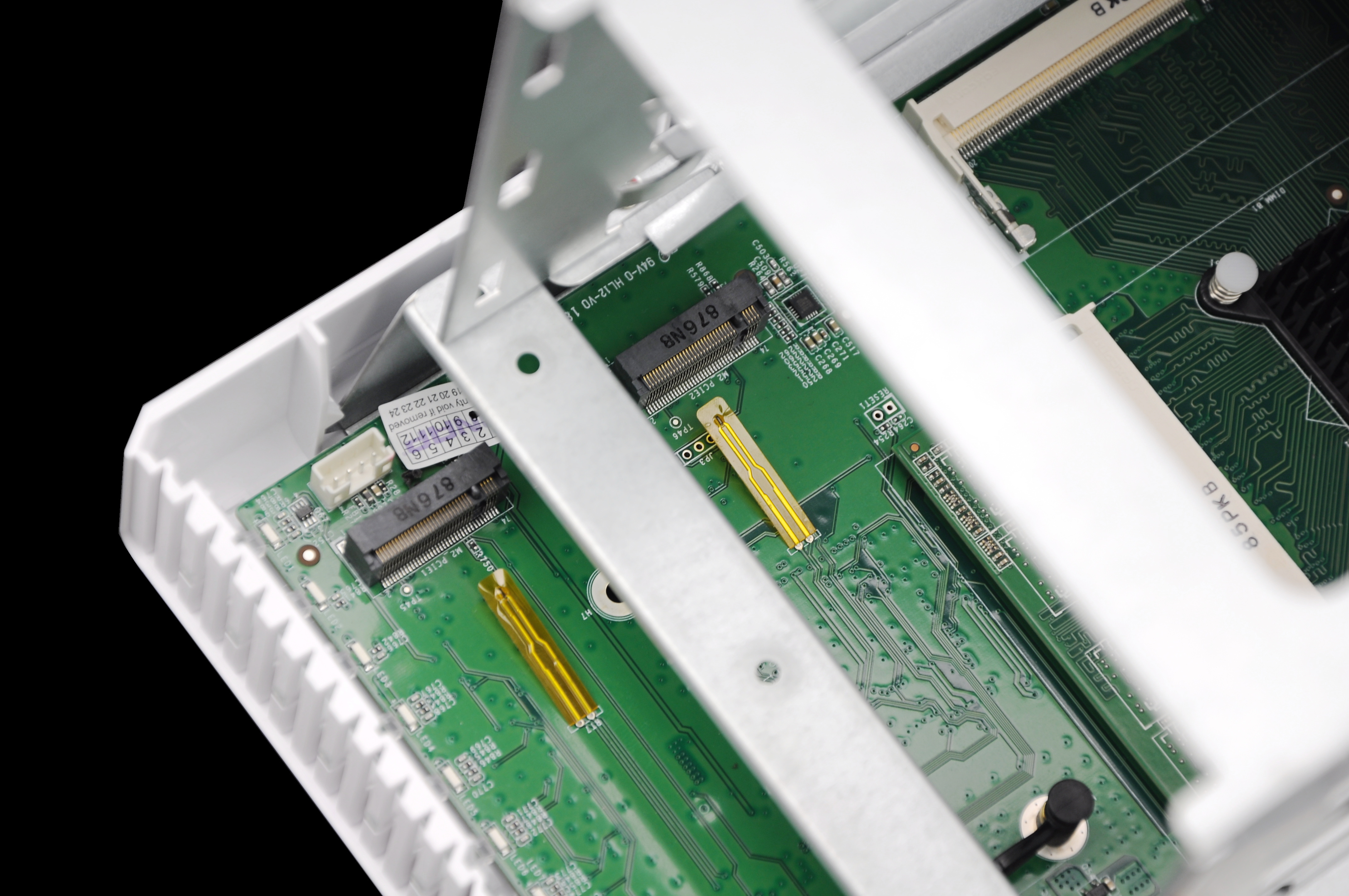 Telo je možno väčšie, než by ste očakávali. Objemovo takmer rovnaké ako u bračekov, ktorí majú o jednu 3,5" šachtu viac. Rolu v tom hrá nadštandardne dlhé PCB, ktoré určuje hĺbku zariadenia (260 mm). Má to však svoje opodstatnenie. Oproti iným návrhom ho spredu predlžujú dva sloty M.2 a zozadu vstavaný reproduktor. Ten slúži na hlásenie zmien stavu zariadenia. Informuje o tom, že je už NAS v prevádzke či sa naopak vypína alebo došlo k poruche a podobne. Netradičná a pozoruhodná funkcia.