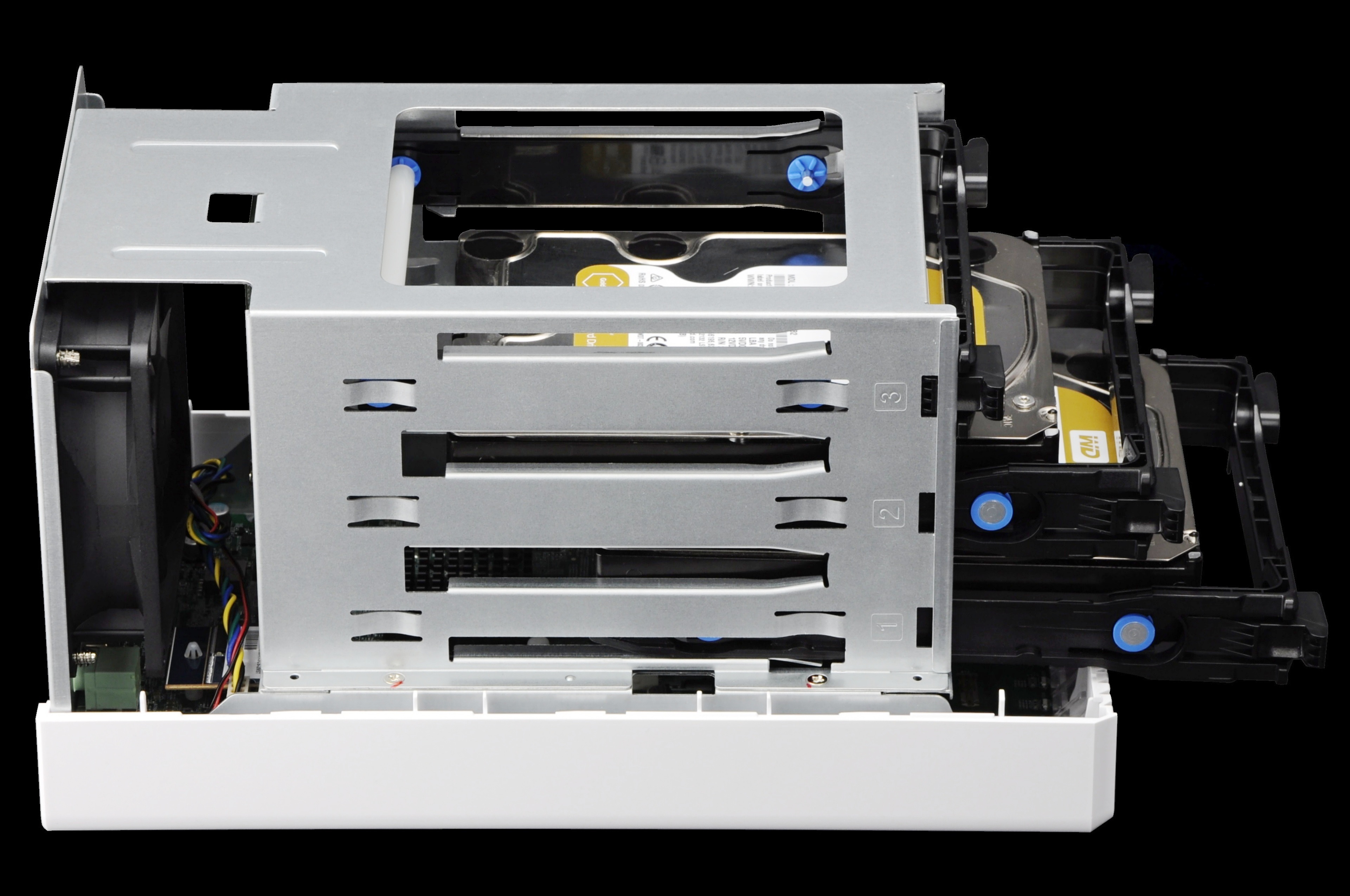 Oceňujem snahu výrobcu robiť niečo proti prenosu vibrácií na skelet. Disky sú v kontakte so šuplíkmi, ktoré sa zasúvajú do masívneho oceľového koša, cez gumené krúžky. Toto riešene je však kozmetického charakteru, dobré na zamedzenie lokálneho drnčania. Chvenie sa samozrejme na kostru a následne podložku prenáša a zvuk z kmitania hlavičiek HDD je takisto niekoľkonásobne zosilnený. Konštrukcia všetkého je inak robustná, dielenské vyhotovenie presné a je otvárací mechanizmus mimoriadne pohodlný – protikusy skrinky do seba intuitívne a presne zapadajú.