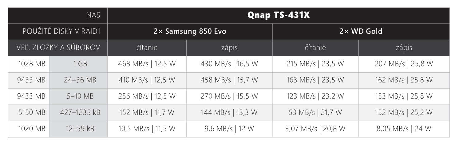 Na testovanie boli použité rýchle platňové disky WD Gold (1005FBYZ), určené do dátových centier, ale takisto podstatne rýchlejšie SSD Samsung 850 Evo, ktoré dokážu lepšie preveriť úzke hrdlo NAS-u. Najväčšie súbory sme nastavili tak, aby nebola pri týchto SSD obmedzujúca cache SLC. Všetky testy prebiehali v RAID1 a procesor použitý v testovacej zostave bol Intel Core i7-5930K.