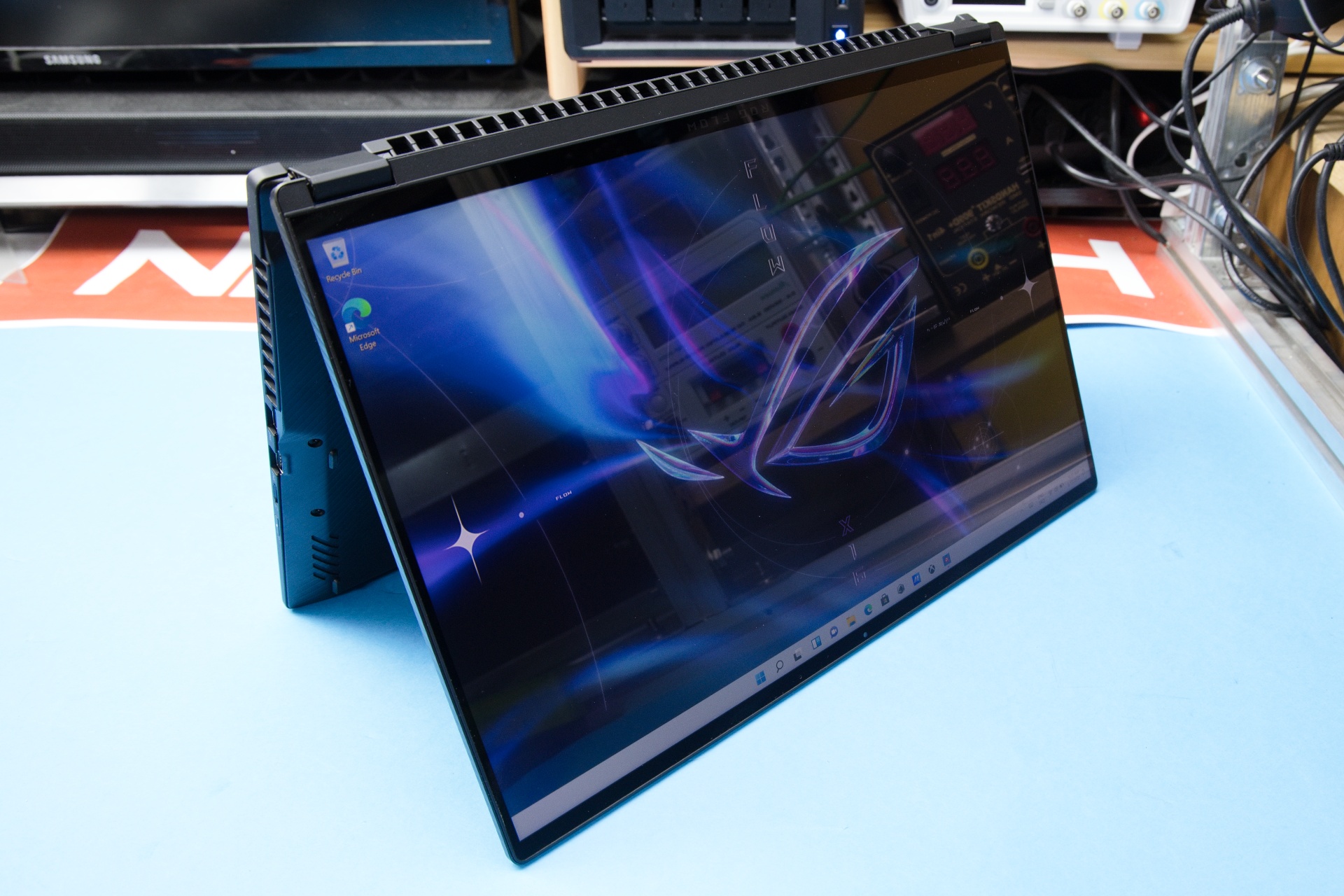 Konvertibilný notebook v recenzovanej zostave mal displej so 4K rozlíšením QHD 2560 x 1600 pixelov a pomerom strán 16:10, na ktorý sa na výšku zmestí viac obsahu, než pri klasickom formáte 16:9. Displej na báze technológie MiniLED má obnovovaciu frekvenciu 165 Hz, jas 1100 nitov, certifikácie Pantone a VESA DisplayHDR 1000 a pokrýva 100% farebného Gamutu DCI-P3.