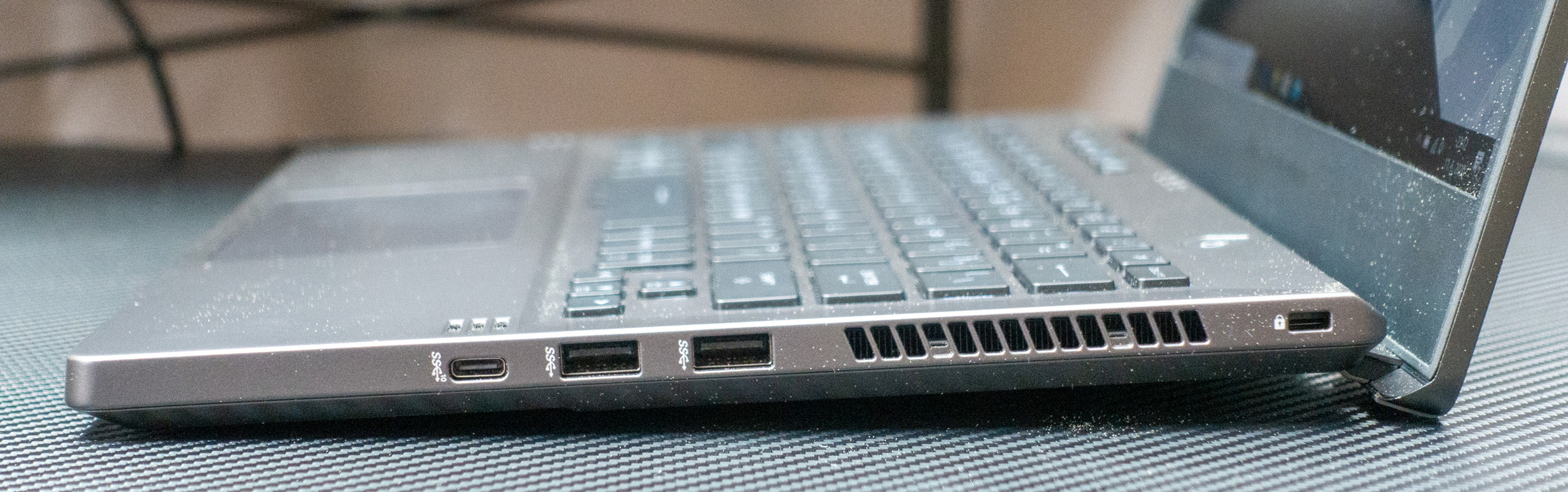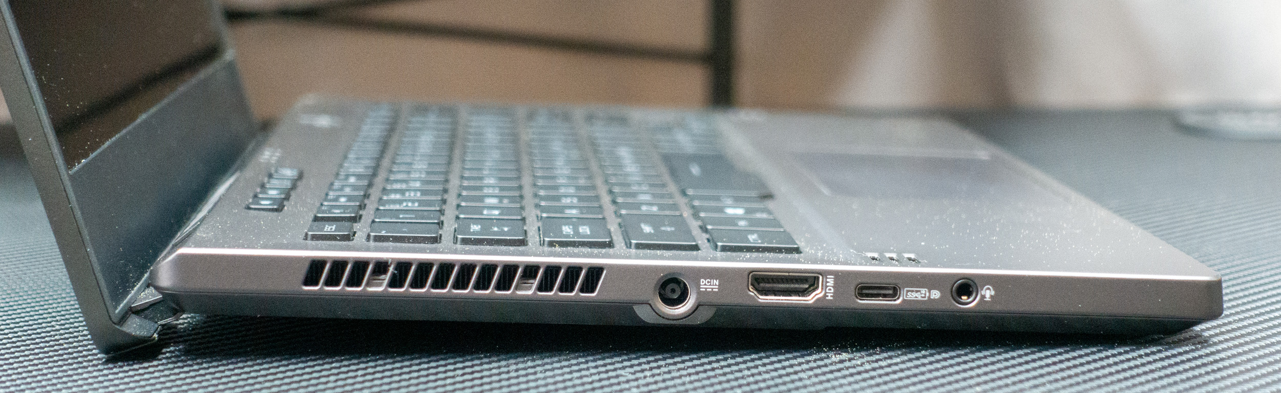Telo z horčíkovej zliatiny je dostatočne robustné a zároveň zliatina z ľahkého kovu veľmi dobre odvádza teplo. Spodná časť je z plastu a kryt displeja z hliníka. Hrany, na ktorých spočívajú zápästia, sú ergonomicky zaoblené. K dispozícii som mal farebný variant Space Gray. Povrchová úprava nie je náchylná na zachytávanie odtlačkov prstov. Displej má veľmi úzke rámiky, čo v praxi znamená, že prístroj so 14-palcovým displejom má rozmery ako bežný 13-palcový ultrabook.