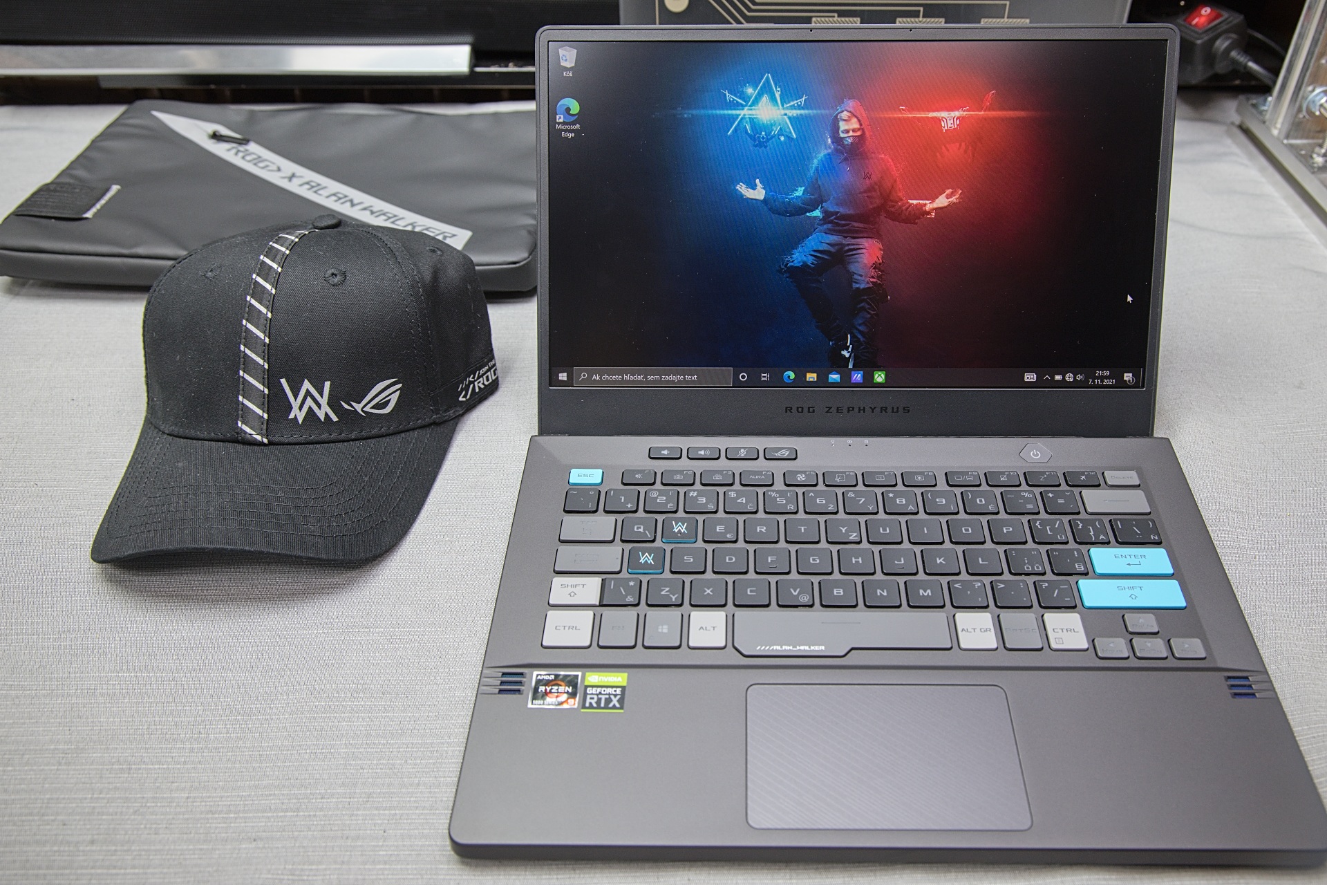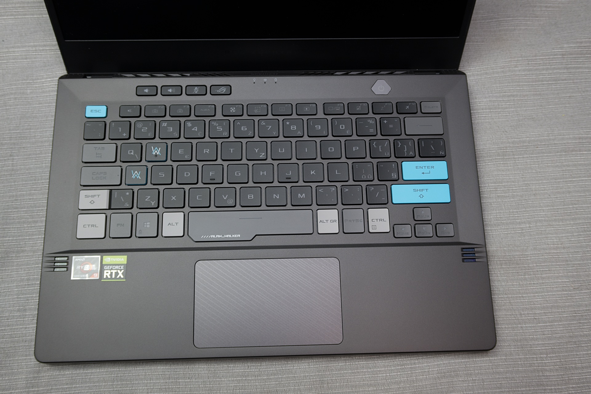 Za nápad s DJ pultom musíme konštruktérov a dizajnérov tejto verzie ROG Zephyrus G14 jednoznačne pochváliť, pretože pri herných notebookoch je dôležitý nielen výkon, ale aj dizajn, rôzne farebné a svetelné efekty a najlepšie aj príbeh alebo prepojenie vizuálu s rešpektovanou známou osobnosťou. Alan Walker je svetoznámy britsko-nórsky hudobný producent a DJ. Preslávil sa hlavne hitmi Faded, Sing Me to Sleep, Alone a The Spectre. Už v mladom veku prejavil záujem o počítače, programovanie a grafický dizajn. Táto vášeň ho neskôr doviedla k prominentnej kariére v elektronickej hudbe. Walker začal ako producent samouk publikovaním svojich skladieb na platformách YouTube a SoundCloud. Dnes má na konte miliardy prehratí na YouTube a Spotify a je uznávaným umelcom, ktorý skladbami pre hry PUBG Mobile a Death Stranding prerazil aj v hernom priemysle. Jeho koncerty nie sú len o hudbe, ale aj o charakteristických svetelných efektoch, kostýmoch a choreografii. Jeden z dôvodov, prečo si ROG vybral štýl od Alana Walkera, je pravdepodobne aj jeho meno, presnejšie iniciály. Pozrite si na obrázku pozornejšie klávesnicu, presnejšie „herné“ klávesy WASD. Klávesy A a W majú namiesto klasického nápisu prispôsobené logá. Klávesnica je veľmi kvalitná a vďaka štandardnému usporiadaniu klávesov, príjemnému zdvihu a presnému chodu sa na nej aj veľmi dobre píše. Touchpad má na ploche jemné pásiky, ktoré sú našťastie realizované tak, že na dotyk ide o celistvú, príjemne kĺžucu plochu bez textúry.