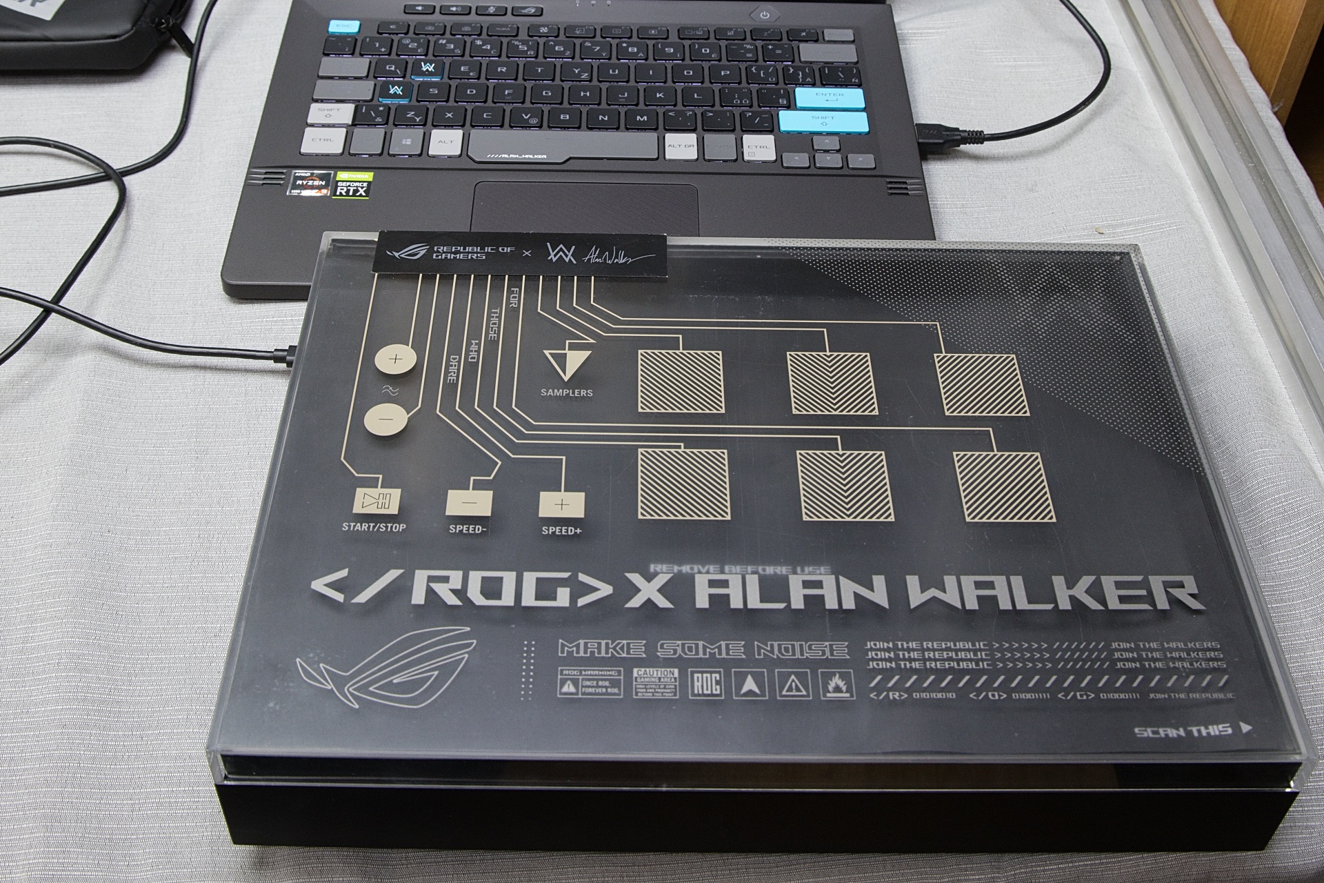 Vráťme sa ešte k príslušenstvu. Primárne sme technologický, a nie lifestylový magazín, takže pribalené dizajnové puzdro, basketbalovú čiapku a dokonca aj ponožky s logom známeho britsko-nórskeho hudobného producenta a dídžeja Alana Walkera spomenieme len okrajovo. Viac pozornosti budeme venovať plastovej škatuli, v ktorej je notebook zabalený. Na priehľadnom veku škatule sú vytlačené kovové plôšky, ktoré fungujú ako dotykové tlačidlá. Ak škatuľu pripojíte k notebooku cez konektor USB-C, získate mixážny pult a hudobný sampler s dotykovým ovládaním. Tento hardvér spolupracuje s aplikáciou ROG Remix a dotykom plôšok sa aktivujú príslušné obrazové a zvukové efekty. Tie vyniknú na každej párty, hlavne ak notebook pripojíte k televízoru alebo projektoru. Rám veka pultu je podsvietený a farba podsvietenia sa v aplikácii Armoury Crate dá zosynchronizovať pomocou funkcie Aura Sync s ďalšími svetelnými efektmi, napríklad s AniMe Matrix LED na veku displeja, čo je jemná matica LED diód, na ktorej sa dajú zobrazovať rôzne statické aj dynamické symboly a efekty.