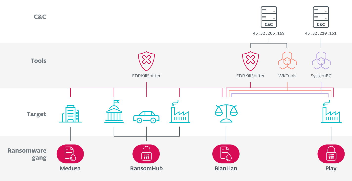 ESET zistil, že partneri RansomHubu pracujú pre tri konkurenčné gangy - Play, Medusa a BianLian. Odhalenie prepojenia medzi RansomHubom a Medusou nie je až také prekvapujúce, keďže je všeobecne známe, že ransomvéroví partneri často pracujú pre viacerých operátorov súčasne. Na druhej strane, jedno z možných vysvetlení toho, prečo majú skupiny Play a BianLian prístup k nástroju EDRKillShifter, je, že si najali rovnakého partnera RansomHubu – to je však vzhľadom na uzavretú povahu oboch gangov nepravdepodobné. Pravdepodobnejším vysvetlením je, že dôveryhodní členovia skupín Play a BianLian spolupracujú s konkurenčnými skupinami, vrátane nových aktérov ako je RansomHub, a následne preberajú a upravujú nástroje získané od týchto rivalov na vlastné útoky. Play bola spojená so skupinou Andariel, ktorá je napojená na Severnú Kóreu.