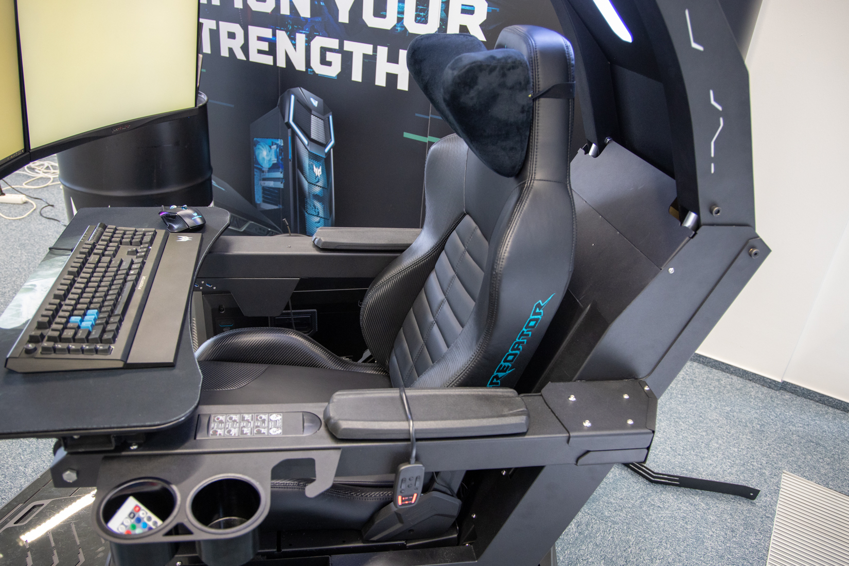 Jediným tlačidlom aktivujete prispôsobenie kresla, aby sa doň mohol hráč pohodlne usadiť. Smerom nahor sa odklopí oblúková konzola, na konci ktorej je upevnená trojica 27-palcových monitorov Predator Z271U so 4K rozlíšením, obnovovacou frekvenciou 144 Hz, technológiou G-SYNC s rozlíšením WQHD (2560 × 1440), a zároveň sa smerom do strany odklopí stolík s klávesnicou.