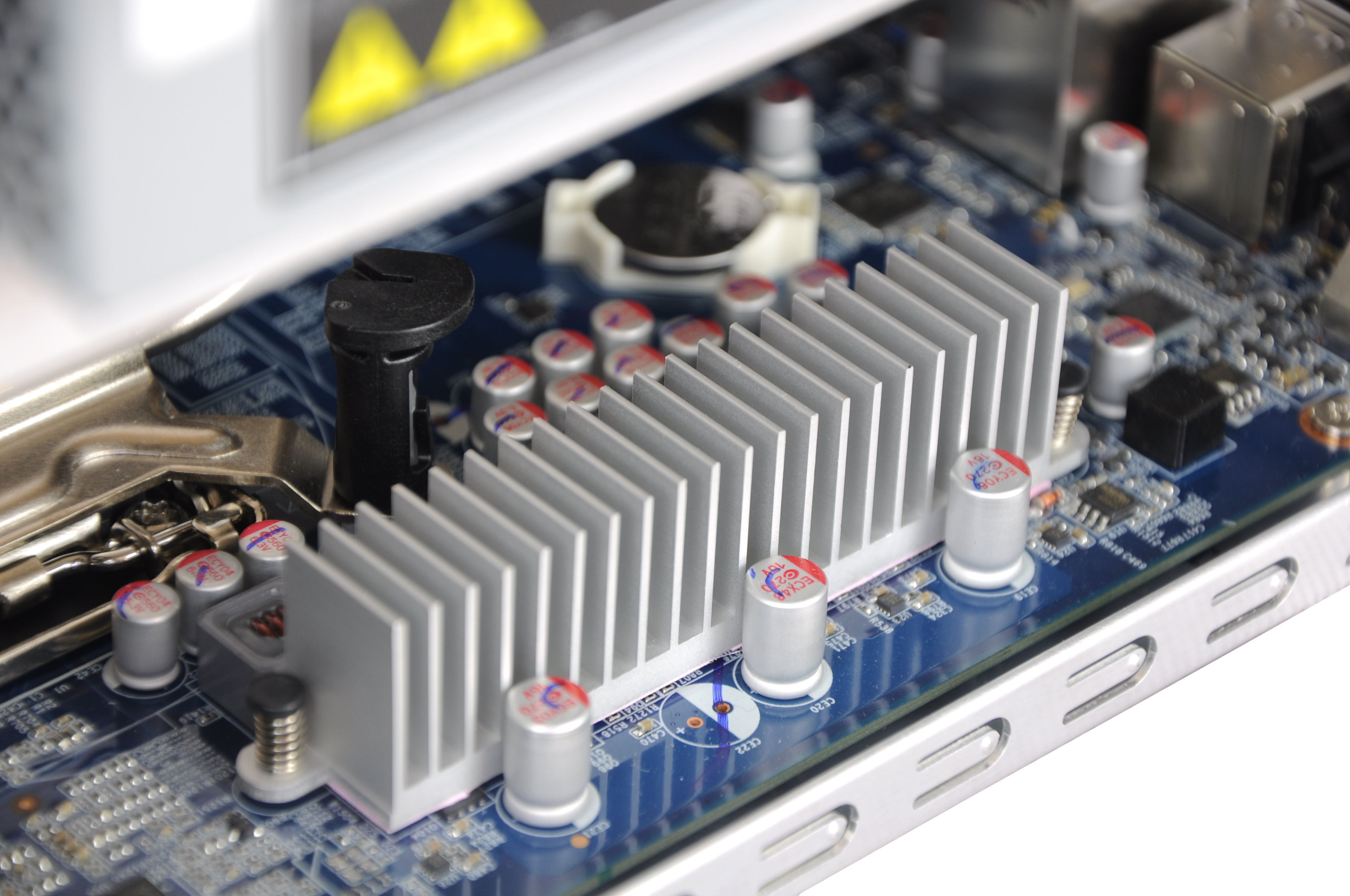 hladenie procesora je riešené nekonvenčne. Nad jadrom je iba blok, z ktorého sa tiahne trojica heatpipe až za ventilátor na výduchu. To celé je lemované tunelom, vďaka čomu ohriaty efektívne uniká von. Hlavne je však tento systém umiestnený na stenu skrinky a nekomplikuje prístup k ostatným komponentom, ako je to bežné pri podobných zostavách postavených na štandardných komponentoch. V tomto prípade je stred voľný a pohodlne sa dostanete tak ku konektorom na optickú mechaniku, disky či k poistke na slote grafickej karty. Azda vyžarovacia plocha mohla byť väčšia, na rozšírenie radiátora je tu dosť priestoru.