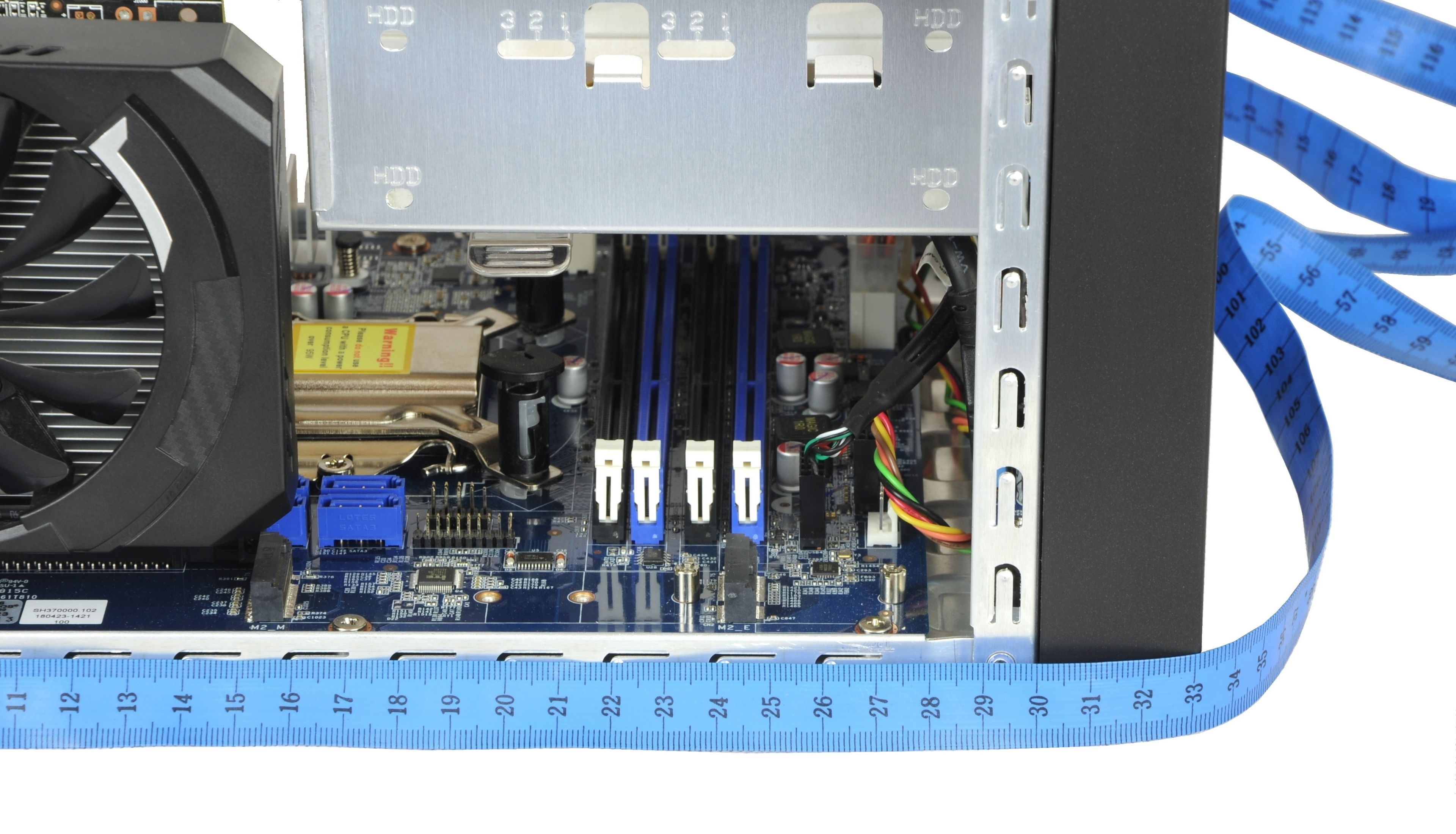 Grafická karta môže mať na dĺžku teoreticky až 30 cm, no ku kolíziám môže prichádzať v iných osiach. Vyššie modely, typicky s väčšími vetrákmi, sú už v konflikte s diskovým košom. Strop (od konektora po najvyšší bod chladiča) je tak 122 mm. K neželanému kontaktu môže dochádzať i zboku. Tie bez backplate sú vedľa kovovej klietky HDD doslova na chlp a grafiky s backplate presahujúce na dĺžku 170 mm sa už môžu „pretláčať“. Vhod by tu padla aspoň nejaká izolácia.