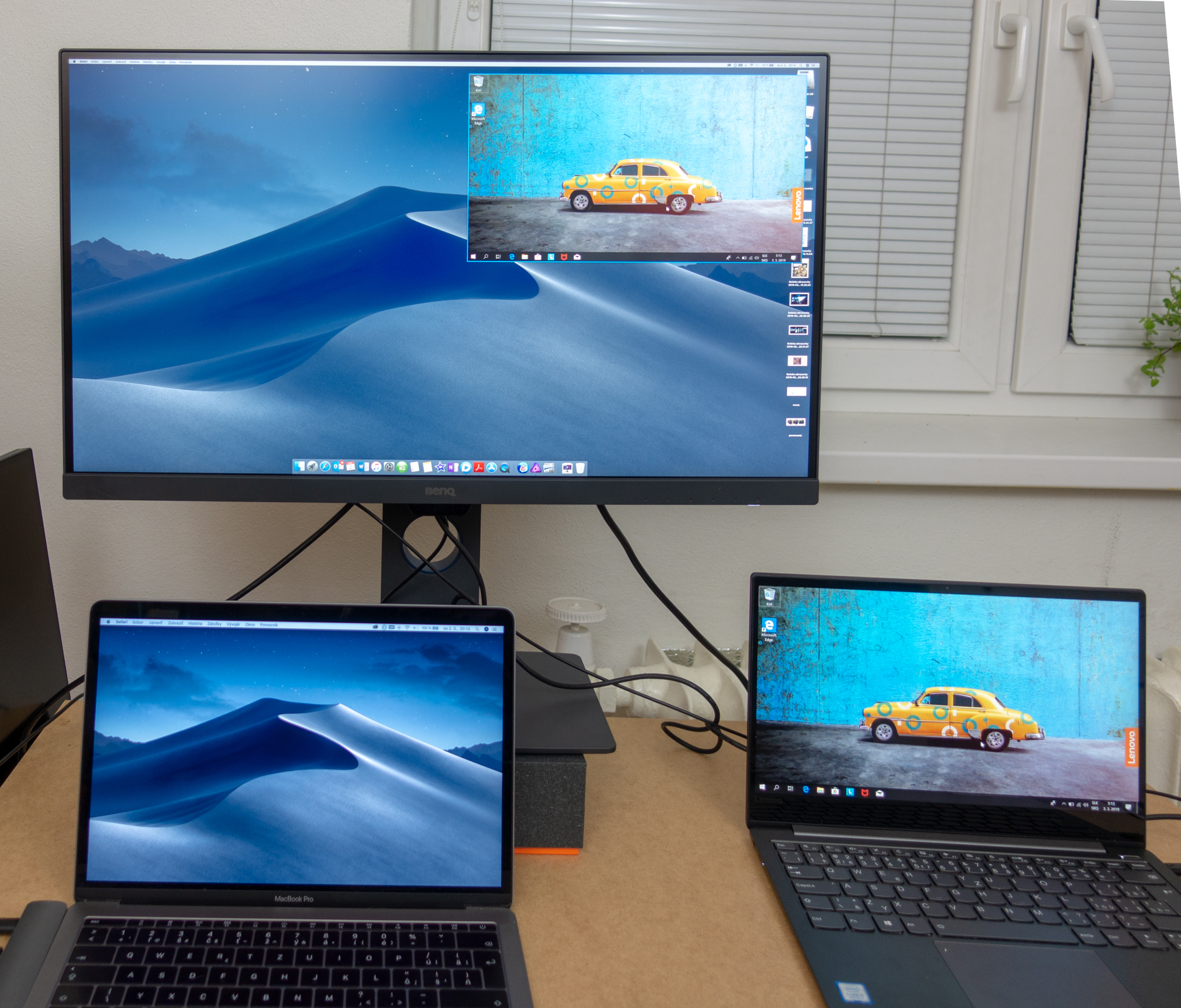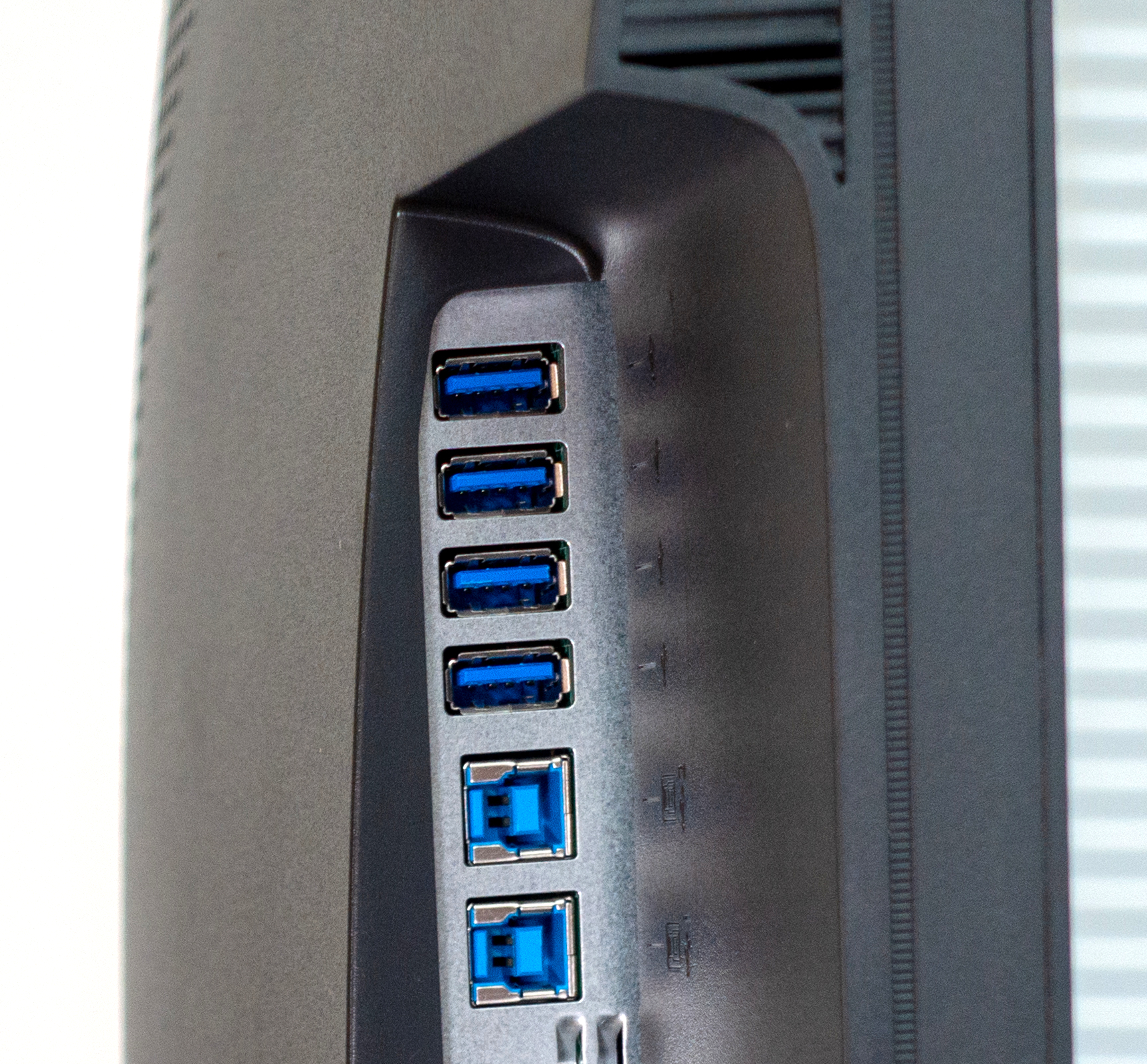 Rozbočovač USB patrí k štandardnej výbave monitorov, pri pozornejšom pohľade na sekciu konektorov USB zistíte, že BenQ PD2700U má dva konektory typu B. Každý z nich môžete pripojiť k inému PC a takto prepínať periférie USB, ako sú klávesnica, myš, tlačiareň či USB disk, medzi dvoma počítačmi. Na prenos obrazu do monitora je k dispozícii jeden DisplayPort, mini DisplayPort a HDMI.