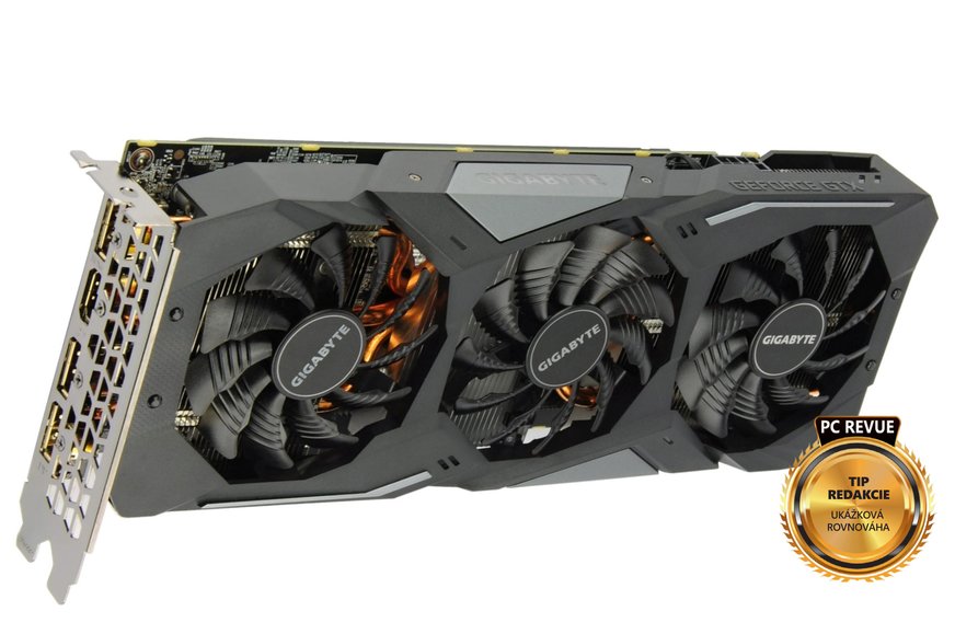 Ventilátory sú tu tri 82-milimetrové, pričom prostredný sa otáča v protismere ostatných na zníženie turbulentného prúdenia a zvýšenie efektivity. Rovnaký systém používa aj výkonnejšia Gigabyte RTX 2080 Gaming OC, len GTX 1660 Ti nie je taká ovešaná „železom“ a má o tretinu nižšiu hmotnosť (670 g).