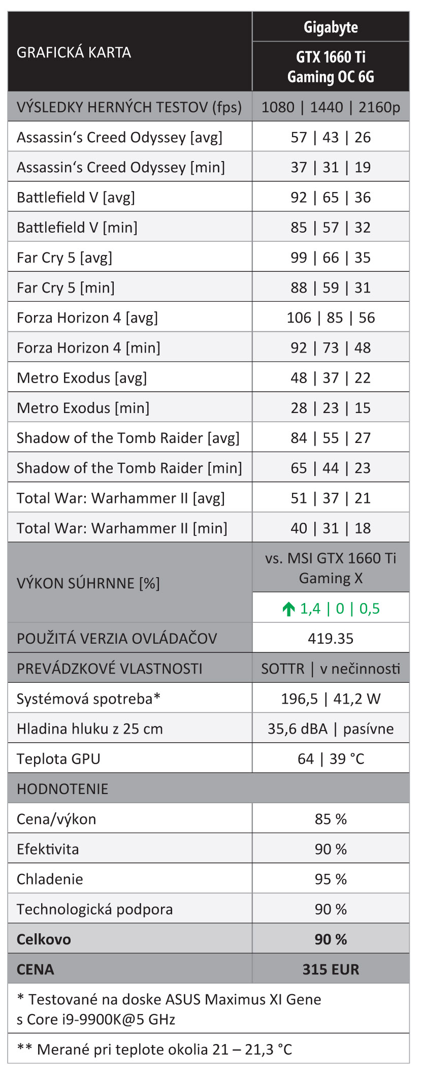 Na lepšie odrazenie sa pri interpretácii výsledkov pomôže porovnanie s konkurenčným modelom MSI GTX 1660 Ti Gaming X. Rozdiely vo výkone siahajú od nepostrehnuteľných po žiadne. Napriek tomu je dobré poznamenať, že maximálna zaznamenaná frekvencia GPU na grafike Gigabyte bola o 30 MHz vyššia (1995 MHz). To môže byť dané o málinko lepším čipom alebo efektívnejším napájaním. Limit spotreby majú totiž obidve karty rovnaký a nameraný príkon na grafike MSI je zhruba úmerne vyšší tomu, o koľko intenzívnejšie je osvetlenie LED RGB. Karta Gigabyte je v tomto smere konzervatívnejšia a jediný svietiaci prvok je logo výrobcu.