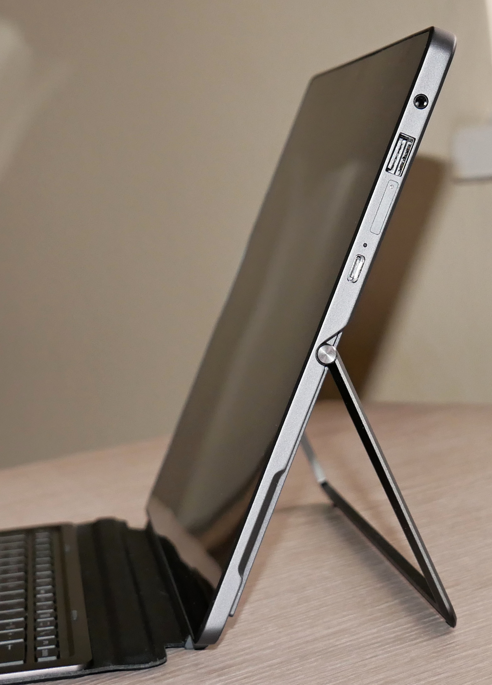Vďaka kovovému rámu toto konvertibilné zariadenie úspešne absolvovalo test odolnosti podľa vojenskej normy MIL-STD 810G7. Zadná stena je plastová, takže nič nebráni prístupu rádiových vĺn k anténam komunikačných rozhraní Wi-Fi, GSM a bluetooth. A čo je ešte potešiteľnejšie, skrutky zakryté odklopným rámovým stojanom naznačujú, že sa zadná stena dá ľahko odobrať. Môžete upgradovať disk SSD a jednoduchému prístupu dovnútra sa poteší aj servisný technik. Plocha okolo klávesnice je tiež kovová, zadná strana je potiahnutá materiálom pripomínajúcim koženku.