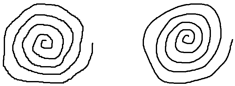 Špirály nakreslené myšami Riotoro Uruz Z5 Classic (vľavo) a so špičkovou Corsair M65 RGB Elite (vpravo). DPI je nastavené rovnako na 4000. Trajektória Uruz Z5 je výrazne zubatejšia