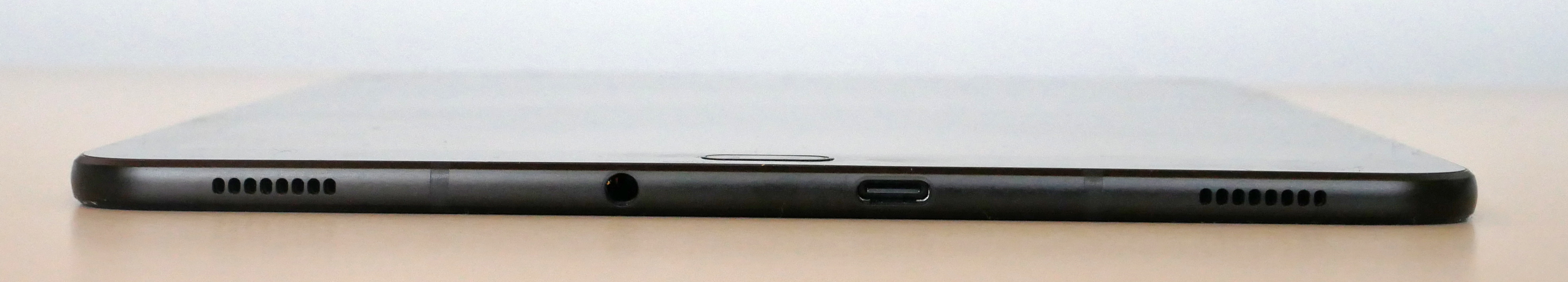 Spodná hrana s dvohicou reproduktormi, konektorom na slúchadlá a portom USB-C