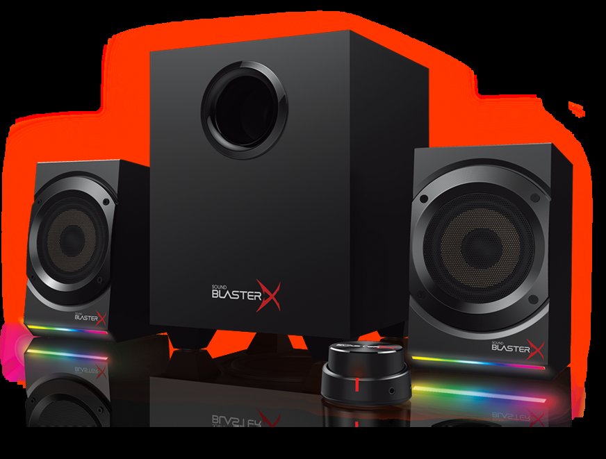 Reproduktory dokonca dokážu imitovať sústavu 7.1. Dva bočné zvýrazňuje LED podsvietenie Aurora Reactive. Môže svietiť alebo pomaly meniť farby stlačením tlačidla vzadu na subwooferi. Ten je celý z dreva, aby lepšie vynikali nízke frekvencie. K subwooferu je pripojený otočný vypínač, ktorý je zároveň aj potenciometrom. V ňom sú zabudované výstupy na slúchadlá a mikrofón. Vstupný zvukový signál môžeme pripojiť viacerými spôsobmi, napríklad káblom USB do PC, ktorý poskytuje vysokokvalitný zvuk s rozlíšením 24 bitov/96 kHz, káblom AUX (nebol v balení) alebo zvukovým káblom CINCH. Väčšinou ho majú domáce kiná alebo DVD prehrávače. Na stiahnutie je k dispozícii program BlasterX Acoustic Engine Pro, kde si môžeme zvoliť jeden z prednastavených herných profilov na ešte lepšiu kvalitu zvuku.