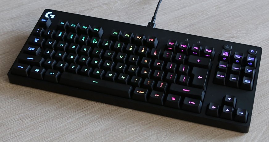 Keďže má klávesnica kompaktné spracovanie, výrobcovia na tento model neumiestnili numerickú klávesnicu. Pri hraní hier totiž nie je potrebná, a tak to hráčom neprekáža. Disponuje aj podsvietením RGB s rozhraním 16 miliónov farieb. S originálnym programom Logitech Gaming Software sa dá každý kláves podsvietiť ľubovoľnou farbou a tlačidlom v pravom hornom rohu možno podsvietenie úplne vypnúť. Zároveň nám ponúka podľa danej hry približne šesť stoviek herných profilov podsvietenia, zablokovanie jednotlivých klávesov pri hraní, aby sa predišlo ich náhodnému stlačeniu (funkcia sa aktivuje stlačením tlačidla herného módu) a samozrejmosť je aj zaznamenávač počtu stlačení jednotlivých klávesov. Funkcia Romer-G zvyšuje odolnosť, presnosť a rýchlosť klávesového signálu až o 25 %, klávesy potrebujú stlačiť iba 1,5 mm na to, aby zaregistrovali vstup. Životnosť vraj dosahuje až 70 miliónov stlačení. Prepracovaná je aj komunikácia klávesnice s počítačom (KSP). Je to signál od stlačenia cez preloženie signálu a následné odoslanie do počítača. S novou technológiu je táto komunikácia rýchlejšia až o 10 ms oproti konkurencii. Bežné klávesnice môžu stlačiť okolo štyroch až šiestich tlačidiel naraz, ale klávesnica Logitech Pro dokáže zaznamenať až 26 tlačidiel naraz. Klávesnica sa pripája odnímateľným káblom USB, dlhým 1,8 m. Samozrejmosť je aj nastaviteľný sklon klávesnice v troch mierach: 0, 4 a 8 stupňov. Je vyrobená na hranie, aj preto nám písanie dlhých textov na nej nešlo veľmi dobre. Klávesnica je oveľa ťažšia, než sme zvyknutí. Pri hraní hier si počínala priam dokonale, klávesy krásne sedeli pod prstami, no pri písaní textov sme nepochodili najlepšie; čo sa však dalo čakať, je to čisto herná klávesnica. Farebné podsvietenie vyzerá v noci nádherne.