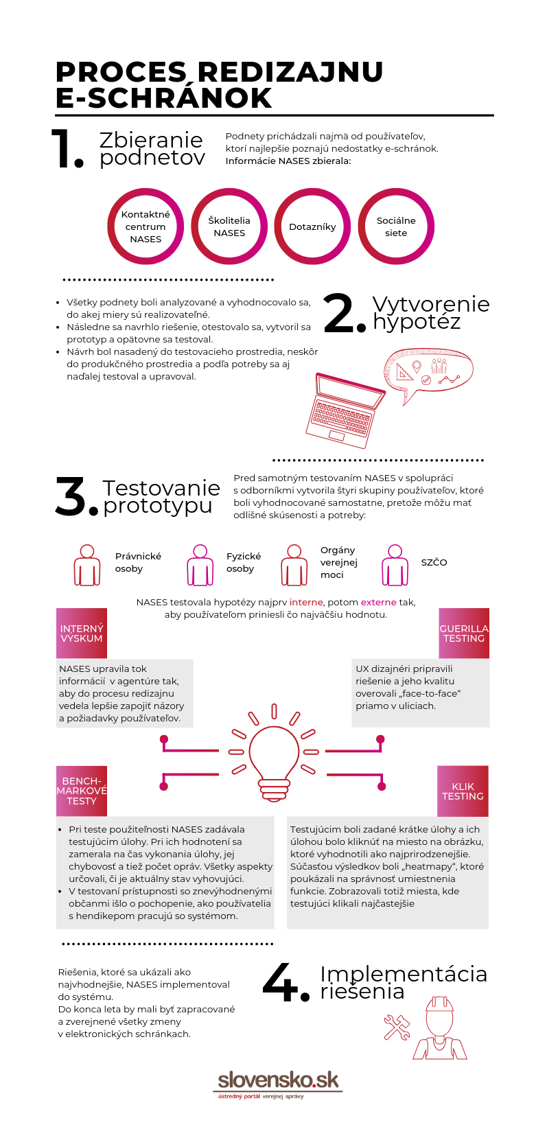 Kam klikne používateľ, keď chce podpísať elektronický dokument? A ako automaticky vytriedi doručené správy? Národná agentúra pre sieťové a elektronické služby (NASES) posledné mesiace odborne skúmala používateľské správanie, vylepšovala funkcie v e-schránkach a testovala realizované zmeny. Práce na týchto vylepšeniach sú takmer na konci a ich výsledkom je intuitívnejšia a pohodlnejšia práca v prostredí elektronických schránok.