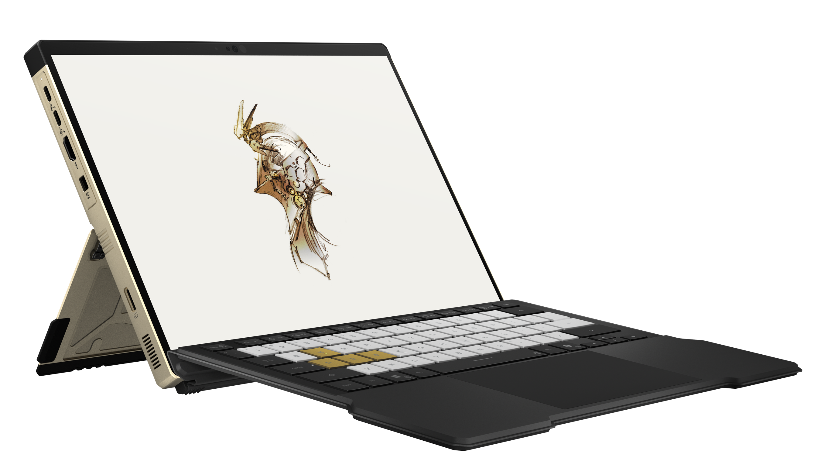 ROG Flow Z13-KJP je stredobodom spolupráce, keďže spája dve dekády herných inovácií značky ROG s vizionárskym rozprávaním štúdia Kojima Productions. Zariadenie je navrhnuté tak, aby odrážalo a zároveň nanovo interpretovalo základné hodnoty štúdia, pričom čerpá hlbokú inšpiráciu z jeho ikonického maskota Ludens. Tento flexibilný výkonný stroj typu 2-v-1 sa dokáže premeniť na hernú konzolu, tablet pre tvorcov, pracovnú stanicu alebo ultraprenosný notebook. Poháňa ho procesor AMD Ryzen AI Max+ 395 s grafickým čipom Radeon™ 8060S a NPU jednotkou s výkonom 50 TOPS, vďaka čomu ponúka výkon na úrovni stolných počítačov a akceleráciu pomocou umelej inteligencie priamo v zariadení, a to v tele s veľkosťou tabletu. 13,4-palcový dotykový displej Nebula HDR s rozlíšením 2,5K, obnovovacou frekvenciou 180 Hz a 100 % pokrytím farebného priestoru DCI-P3 poskytuje filmový obraz a mimoriadne plynulý pohyb. Odnímateľná klávesnica a tenké šasi umožňujú hrať sa a tvoriť kdekoľvek. Dizajn od Yojiho Shinkawu spája umenie a techniku do zberateľského celku, ktorý dopĺňa exkluzívne balenie Kojima Productions, špeciálne témy v aplikácii Armoury Crate a tapety inšpirované postavou Ludens.