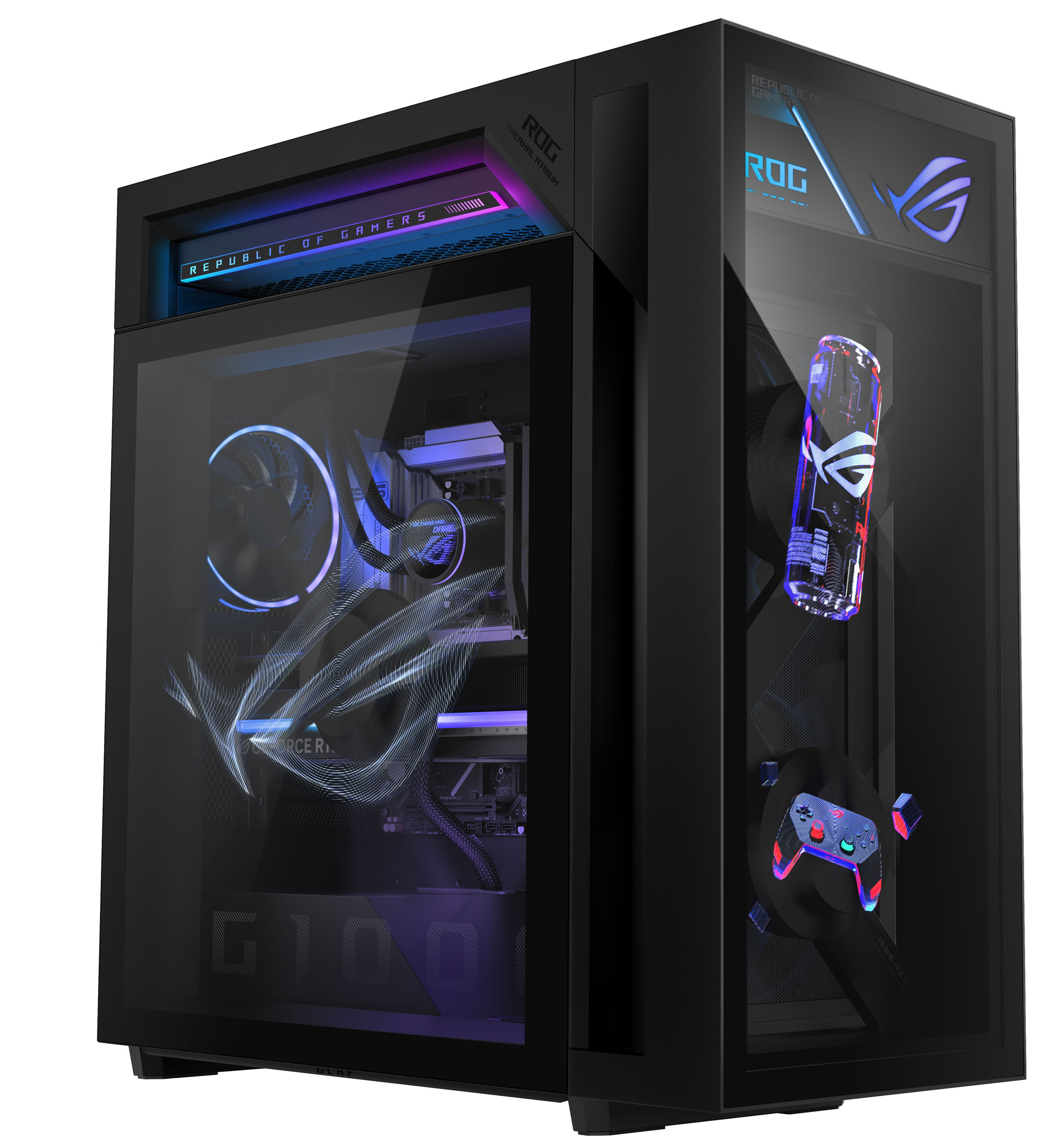 ROG G1000 nanovo definuje herný stolný počítač spojením extrémneho výkonu s jedinečnou holografickou inováciou v podobe ventilátora AniMe Holo, ktorý dokáže premietať prispôsobiteľné vizuály bez negatívneho vplyvu na chladenie či hlučnosť. Vďaka pokročilému systému ROG Thermal Atrium, výkonným grafickým kartám NVIDIA alebo AMD, až 128 GB DDR5 pamäte a rýchlemu PCIe 4.0 SSD je G1000 pripravený na maximálny výkon.