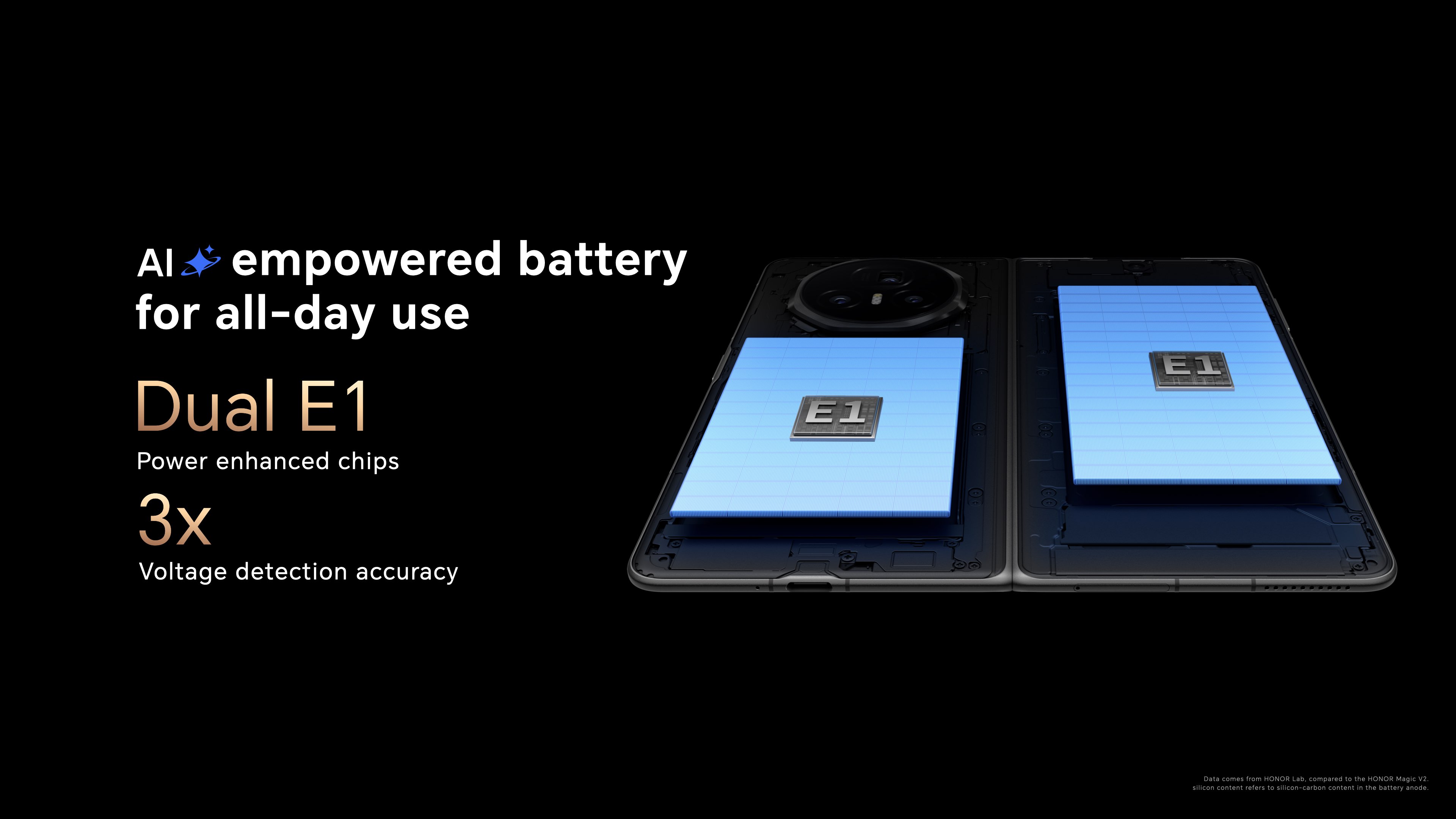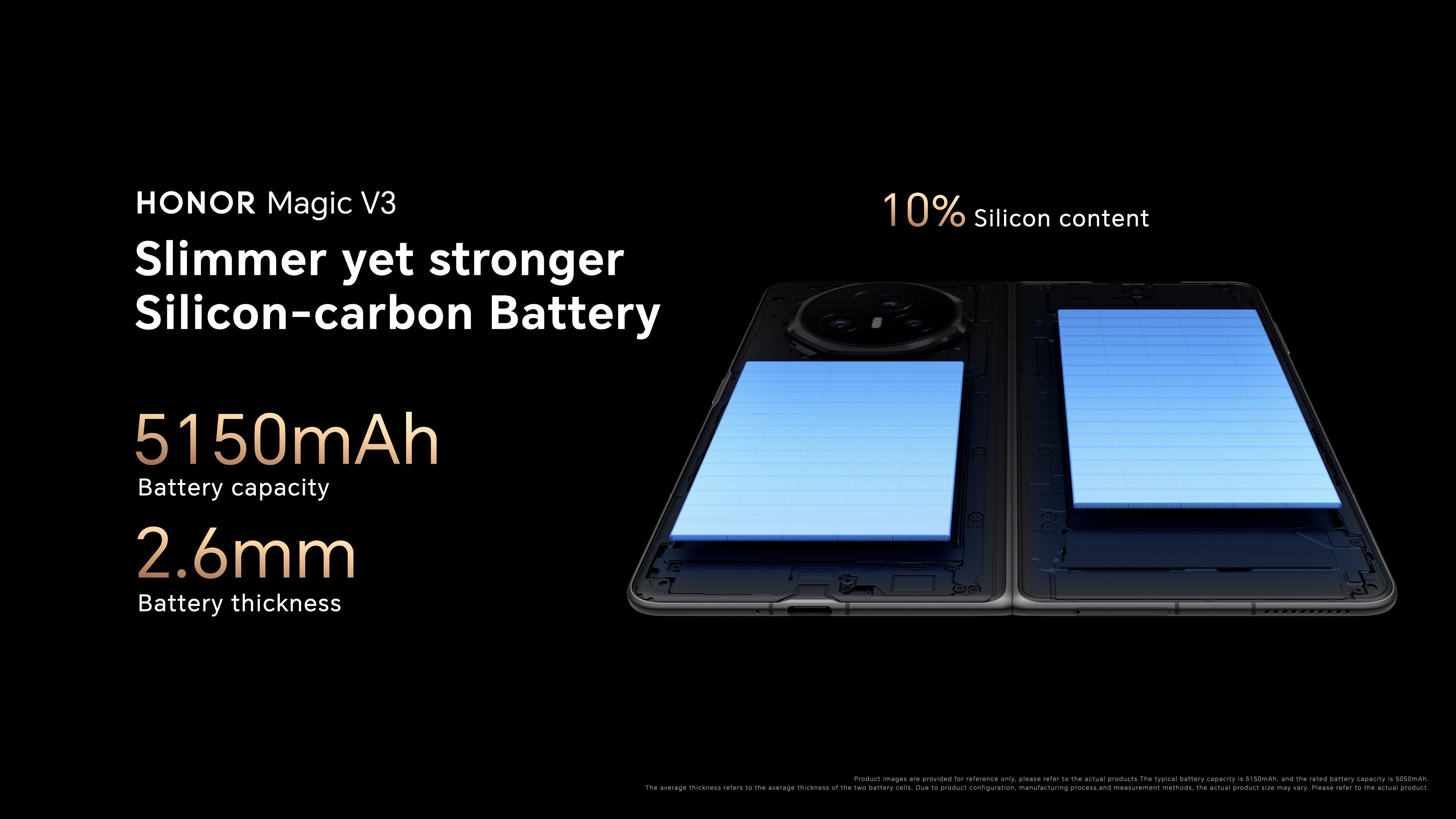 Vzhľadom na obrovský potenciál anódového materiálu na báze kremíka, ktorý je schopný prijímať lítium, spoločnosť HONOR efektívne využila svoje schopnosti na vývoj svojej technológie batérií. Integráciou kremíkových a uhlíkových materiálov dokázala spoločnosť HONOR vytvoriť robustnú a vysoko výkonnú elektrochemickú štruktúru. Na základe tohto úspechu vyvinula spoločnosť HONOR pre HONOR Magic V3 špičkovú kremíkovo-uhlíkovú batériu tretej generácie, ktorá zvyšuje podiel kremíka v zápornej elektróde na 10 %.[3] Pozoruhodné je, že to dosahuje s priemernou hrúbkou batérie iba 2.6 mm[4]. V porovnaní s Magic V2 má HONOR Magic V3 zníženú hrúbku batérie o 4,4 %[5] a zároveň dosiahol zvýšenie hustoty energie o 5,74 %.[6]