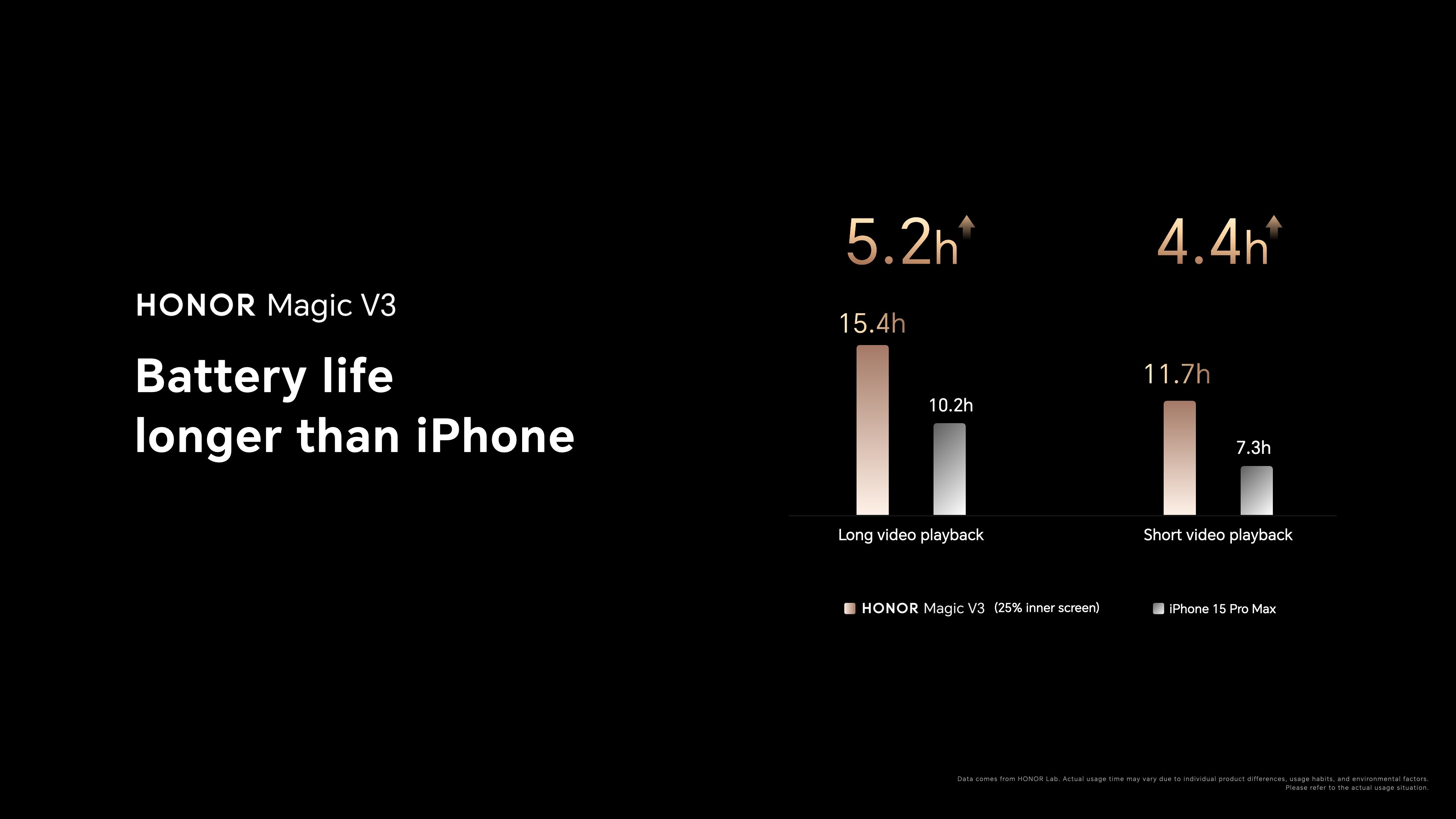 [7] Typická kapacita batérie je 5150 mAh, menovitá kapacita batérie je 5050 mAh. Údaje pochádzajú z laboratórií HONOR.