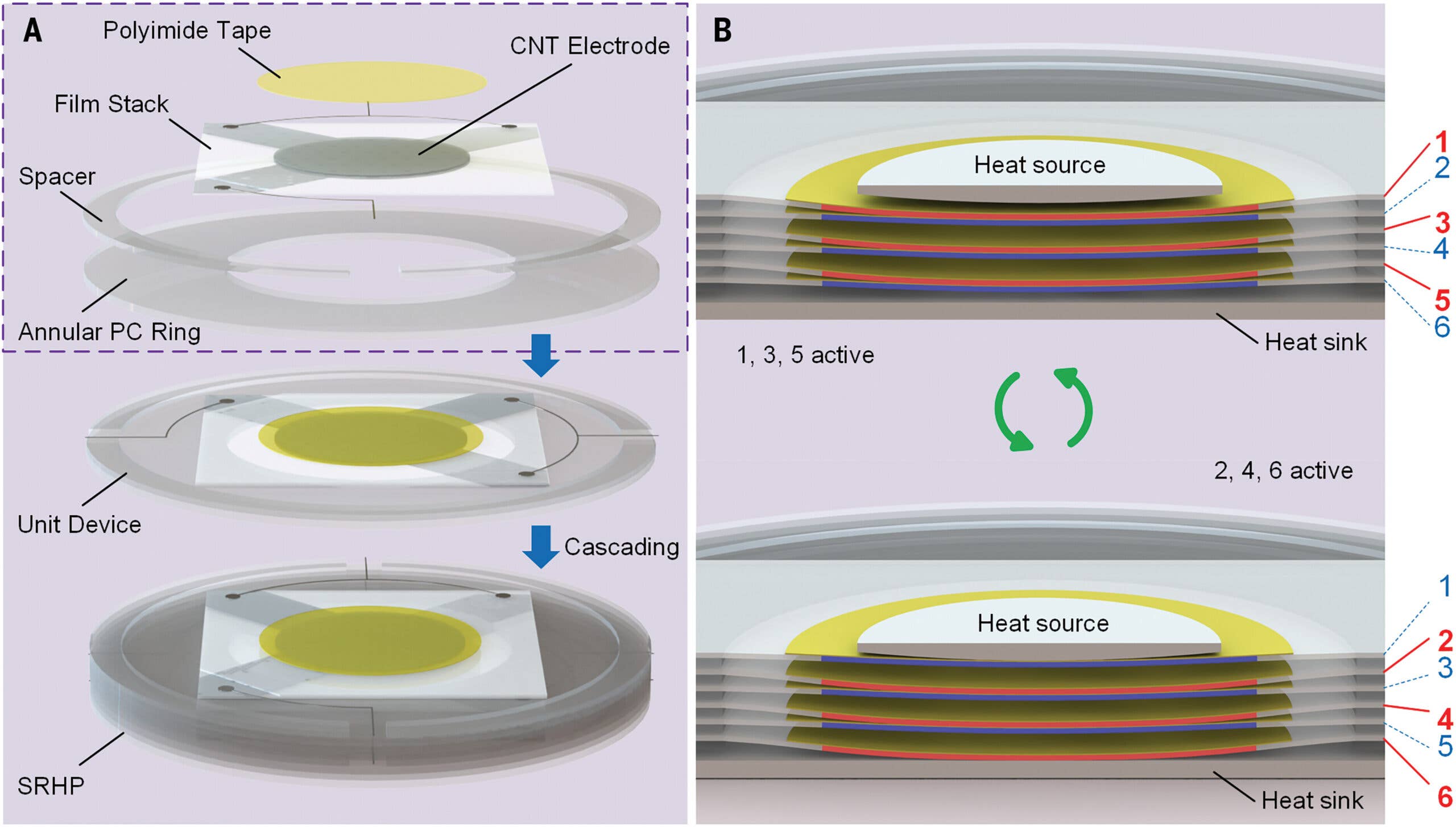 Keď je elektrické pole zapojené, reťazce polyméru sa zoraďujú, čo spôsobuje uvoľňovanie tepla, a keď sa pole odstráni, absorbuje sa teplo, čo vedie k ochladzovaciemu účinku. Vďaka týmto rýchlym a vratným zmenám je tento polymér ideálny pre technológiu chladenia. SRHP je kaskádový systém, ktorý pozostáva zo šiestich na sebe uložených jednotiek vyrobených z týchto polymérových fólií. Sú potiahnuté elektródami z uhlíkových nanorúrok a oddelené polyimidovými vrstvami, ktoré pomáhajú udržiavať stabilitu a zlepšujú prenos tepla.