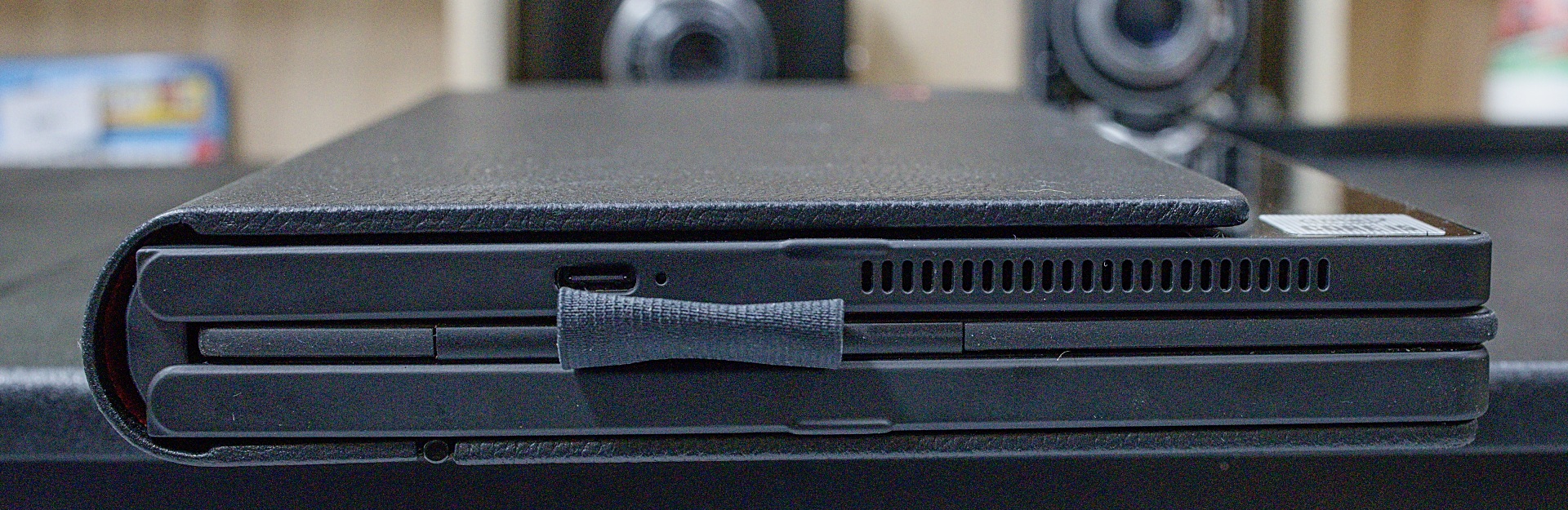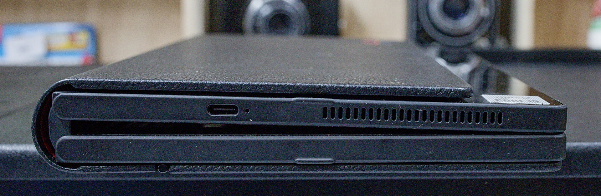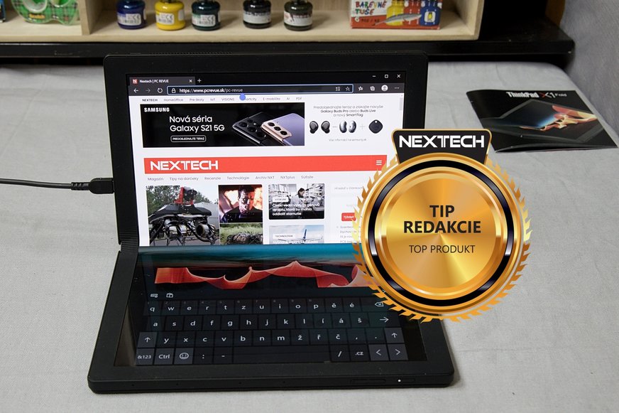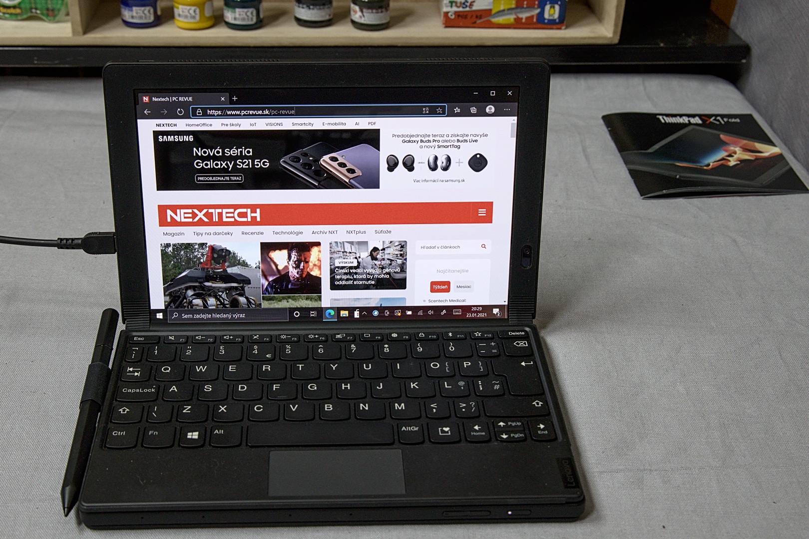 Zložený ThinkPad X1 Fold sa ľahko zmestí aj do menšej kabelky. Klávesnica je usporiadaním kláves a trochu aj rozmerovo prispôsobená tak aby sa vošla do zloženého zariadenia. Klávesnica sa nabíja buď bezdrôtovo keď je v zatvorenom zariadení, alebo cez micro USB port. Nepíše sa na nej zle, ale chce to zvyk. Taktiež miniatúrny touchpad je pod klávesmi pravdepodobne len preto aby vás odradil od jeho používania a začali ste v maximálnej miere využívať dotykový displej a/alebo myš. Ak budete toto zariadenie či už doma, alebo v kancelárii využívať na písanie dlhších textov, odporúčam investovanie do externej klávesnice štandardných rozmerov. Ja používam externú klávesnicu ThinkPad s trackpointom a neviem si ju vynachváliť.
