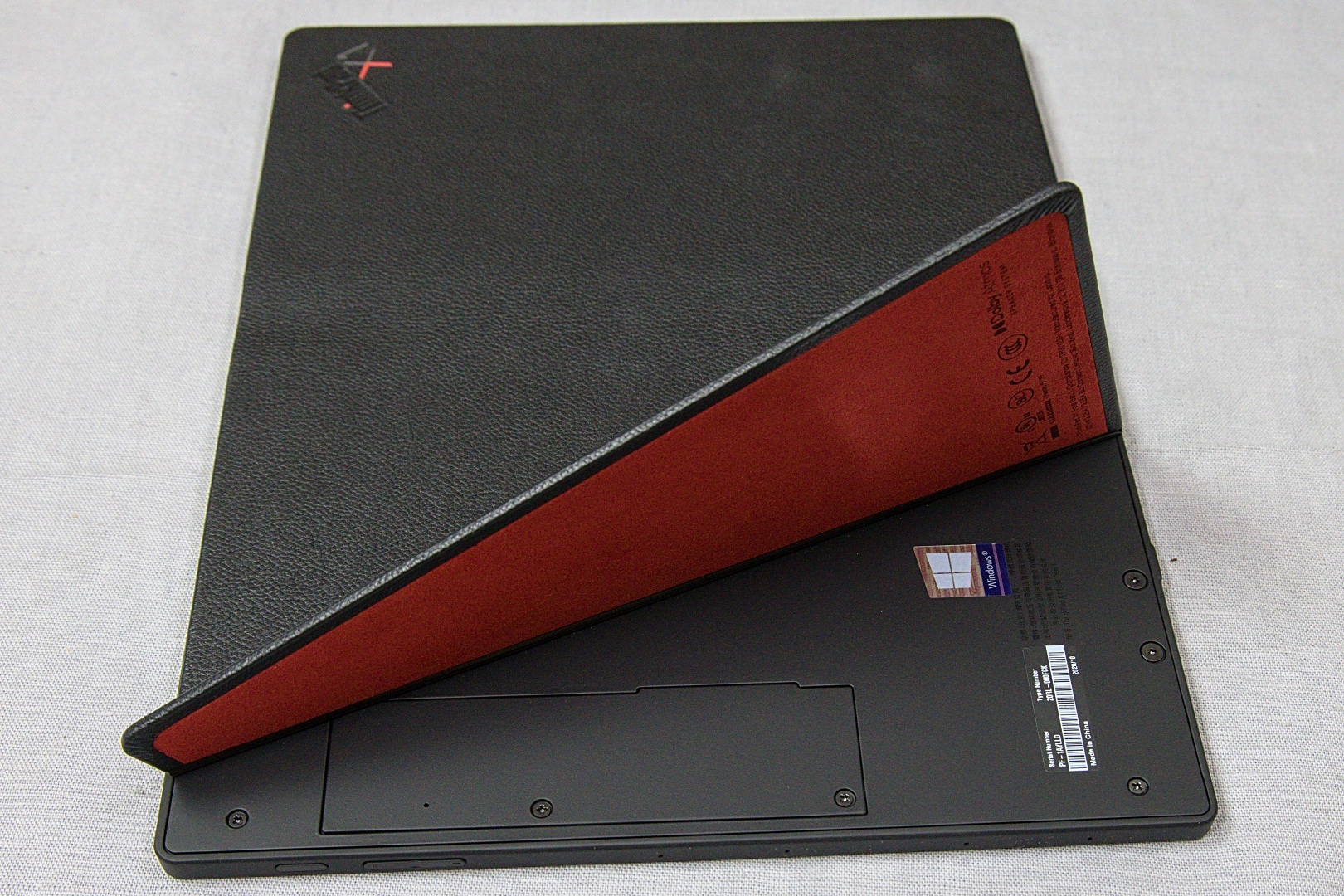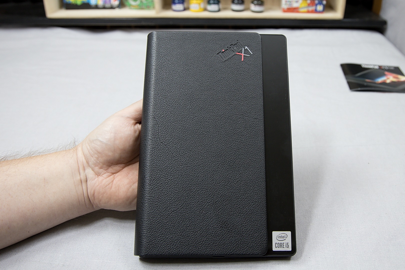 Konštrukcia je napriek kompaktným rozmerom dostatočne pevná vrátane kĺbu, ktorý je pevný a stabilne fixovaný pri akomkoľvek uhle otvorenia. Displej je po roztvorení na pohľad homogénny, takže pri letmom pohľade ani nezistíte, že sa v strede ohýba. Pri skúmaní hmatom zistíte, že displej tvorí viac vrstiev a zrejme bude náležite odolný. Zadnú časť dizajnovo aj funkčne dotvára kožený kryt, ktorého časť na šikmom závese po odklopení slúži ako stojan. Koža je nielen prémiový, ale aj trvanlivý materiál. Uvedomil som si to, keď som pri nakrúcaní videa použil svoj kožený diár, ktorý som denne používal vyše 20 rokov a jeho kožený obal stále vyzerá dobre.