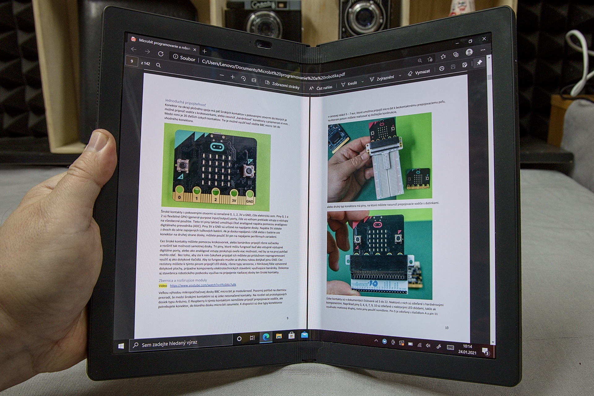 Úplne intuitívne sa mi pri roztváraní ponúkla aj ďalšia poloha, ktorá len umocňuje analógiu s poznámkovým blokom, alebo v tomto prípade skôr knihou je možnosť čítania dokumentov, alebo e-kníh na dvoch stránkach, presne tak, ako keby ste čítali knihu.