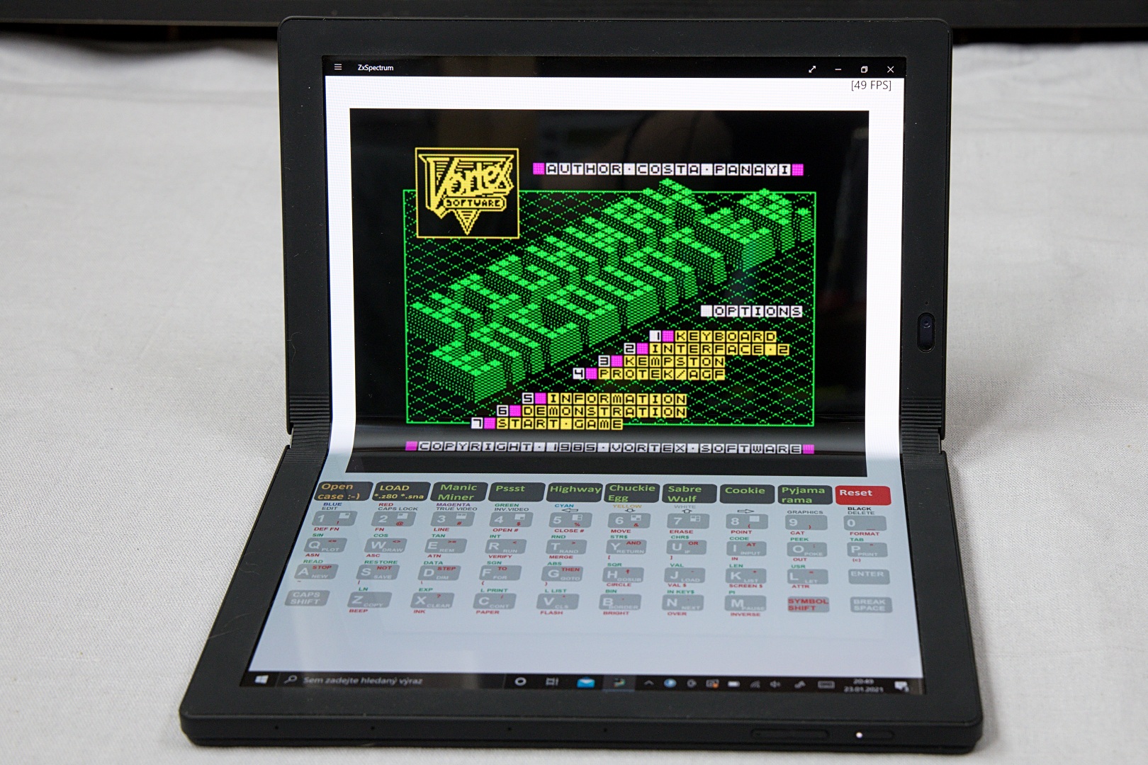 Čo sa týka komfortu práce tak v Lenove vynikajúco zvládli prispôsobenie Windows zobrazovacím možnostiam skladacieho displeja. Treba si uvedomiť, že ThinPad X1 Fold je de facto prvým zariadením tohto druhu a Windows 10 v režime tablet by v porovnaní trebárs s iOS na iPade potreboval ešte trochu doladiť drobné detaily, hlavne čo sa týka ovládania gestami. Pre zaujímavosť som vyskúšal svoju vlastnú aplikáciu simulátor mikropočítača ZX Spectrum ktorú som robil asi pred piatimi rokmi pre Windows 8 (je v aplikačnom obchode) a táto aplikácia fungovala perfektne vo všetkých režimoch skladacieho displeja.