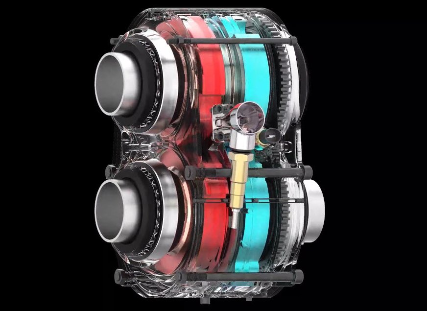 Prvý pár funguje ako kompresor, nasáva a stláča vzduch do predkomory a následne do zadného páru, ktorý má na starosti spaľovanie a výfuk. Kompresor stláča nasávaný vzduch na 13,7 až 20,7 baru (na porovnanie, pri klasickom preplňovanom motore je to okolo 2,4 baru). Omega 1 má hmotnosť 15,9 kg a produkuje výkon 160 koní a krútiaci moment 230 Nm, maximum je 25 000 ot./min. Na porovnanie, typický trojvalcový 1,0-litrový benzínový motor váži okolo 97 kg a produkuje výkon o niečo viac ako 120 koní.