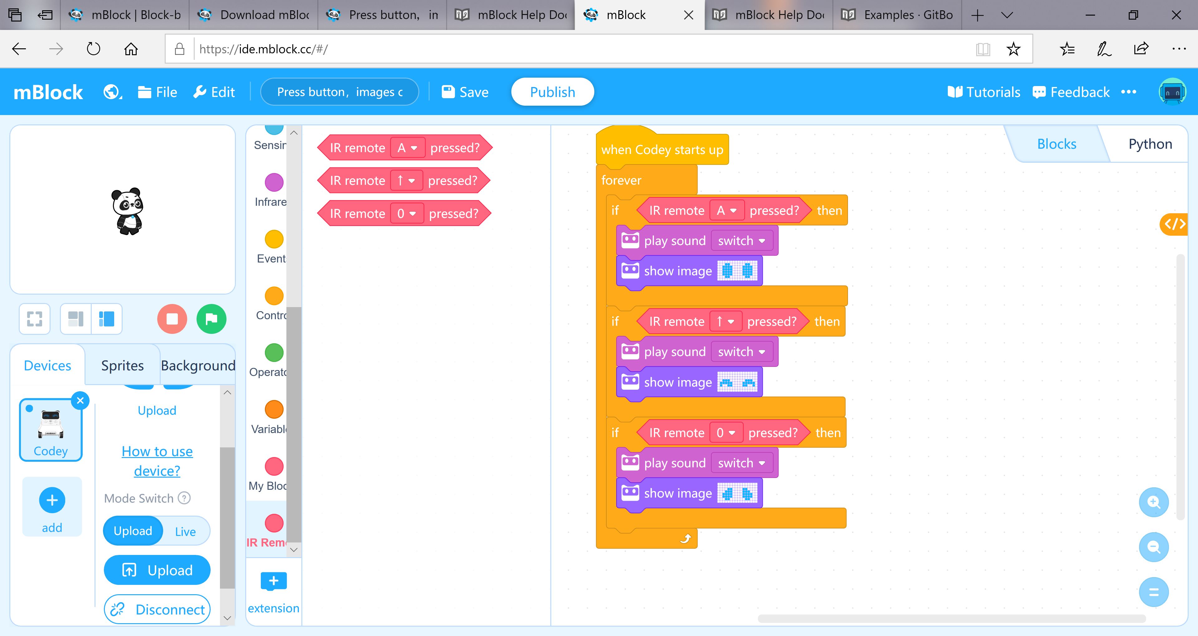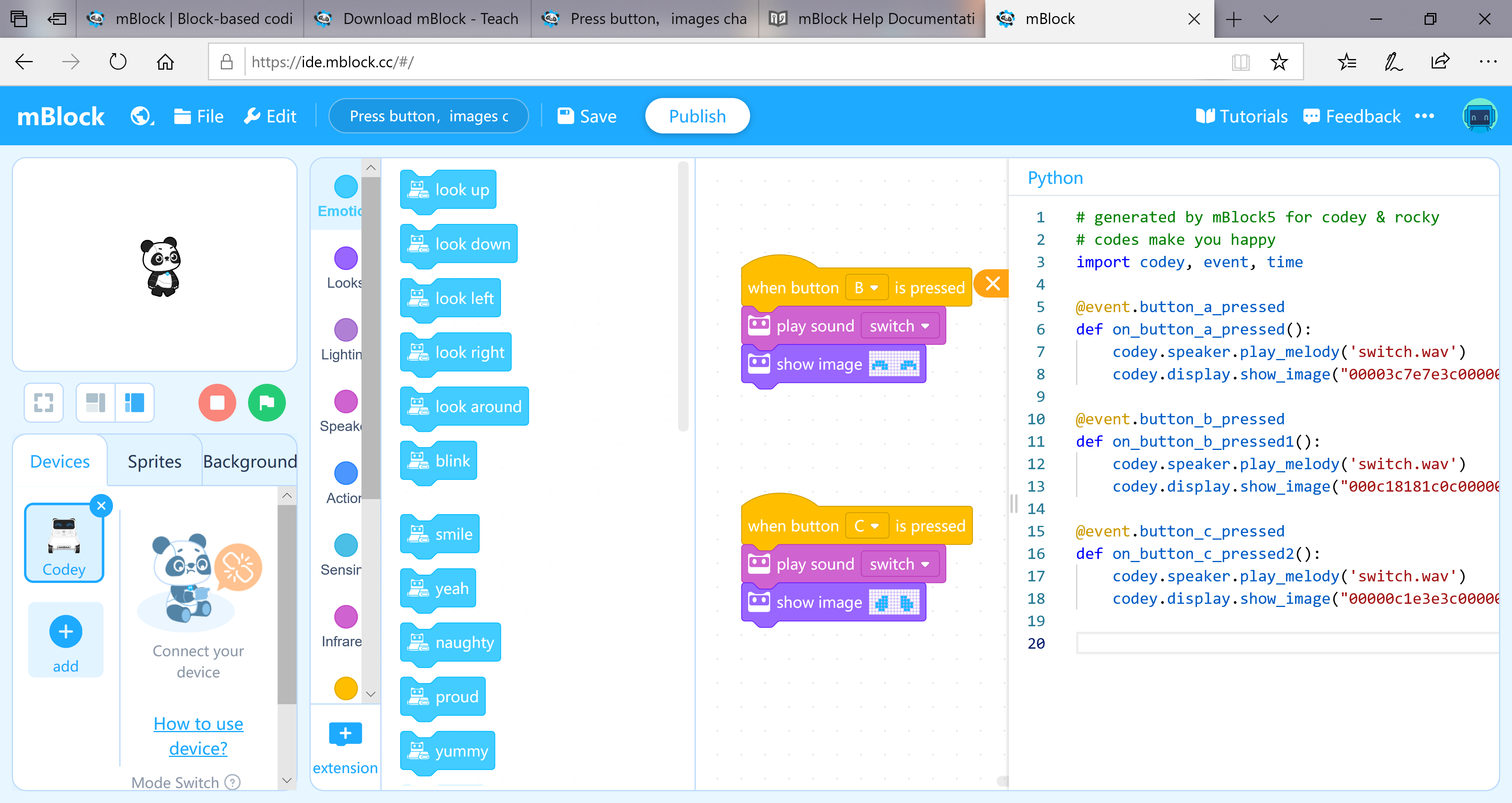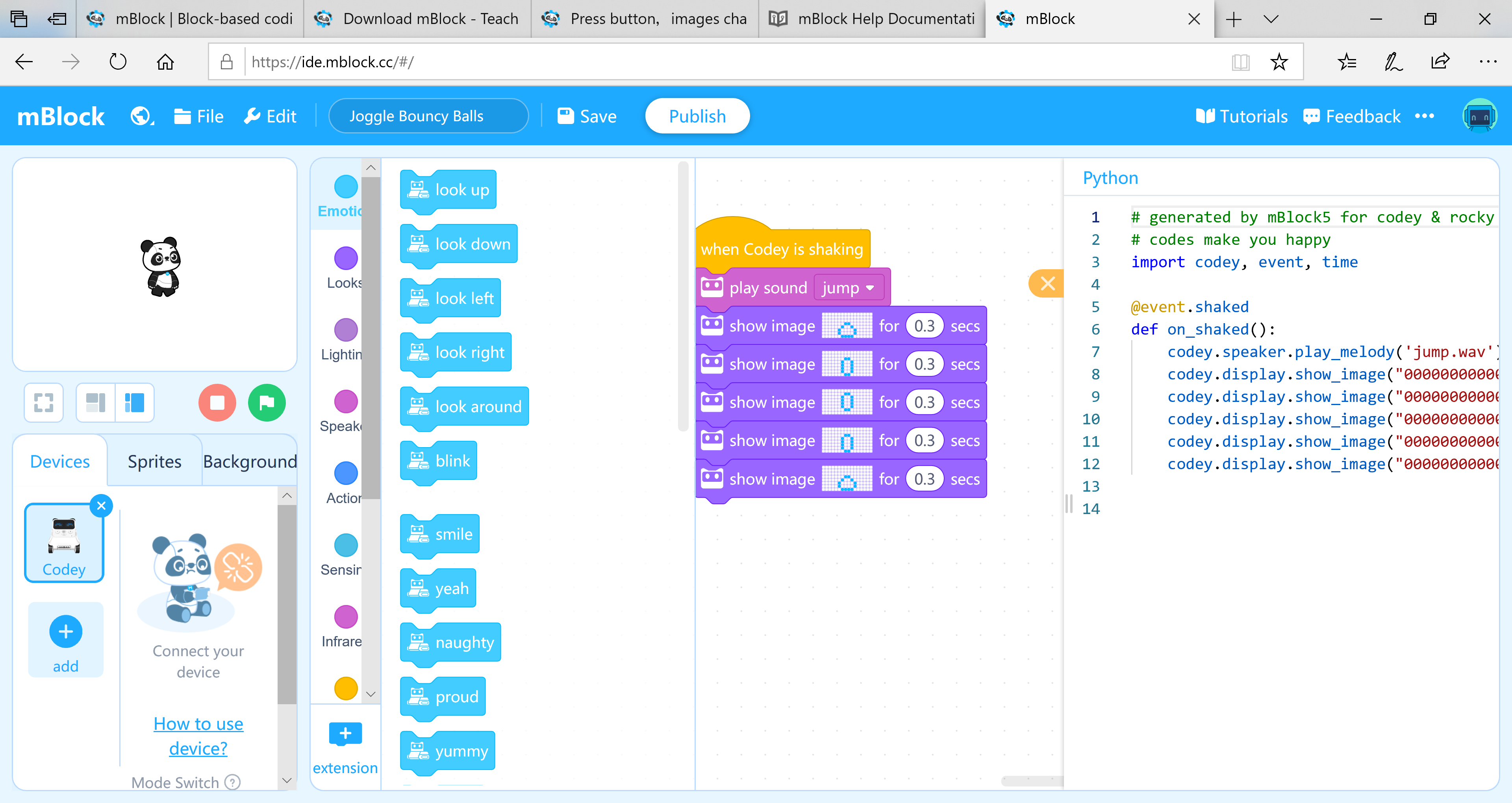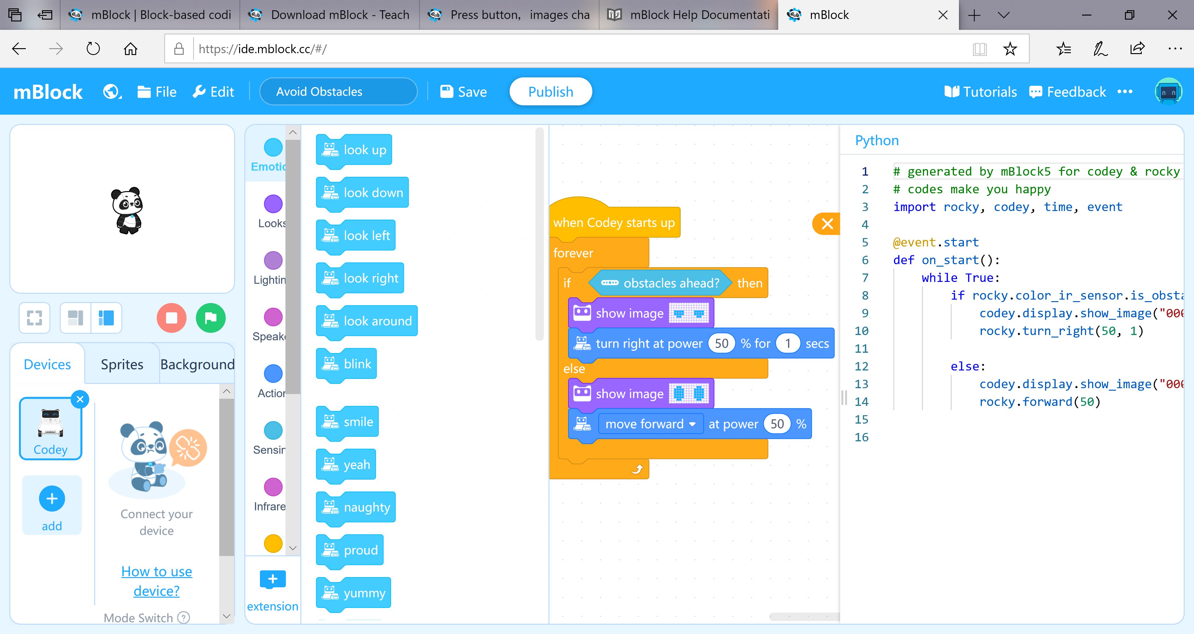 Vývojové prostredie mBlock 5 je založené na grafickom blokovom programovacom jazuku Scratch 5.0. Ako už bolo spomenuté robot Codey Rocky môžete programovať aj v programovacom jazyku Python. V každom programe sa môžete prepínať medzi zobrazením kódu aplikácie v blokoch a Pythone. Nakoľko Python má podstatne širšie možnosti než grafický programovací jazyk, môžete začať vytvárať kód v Pythone, s príkazmi a programovými konštrukciami, ktoré nemajú ekvivalent v grafickom jazyku.