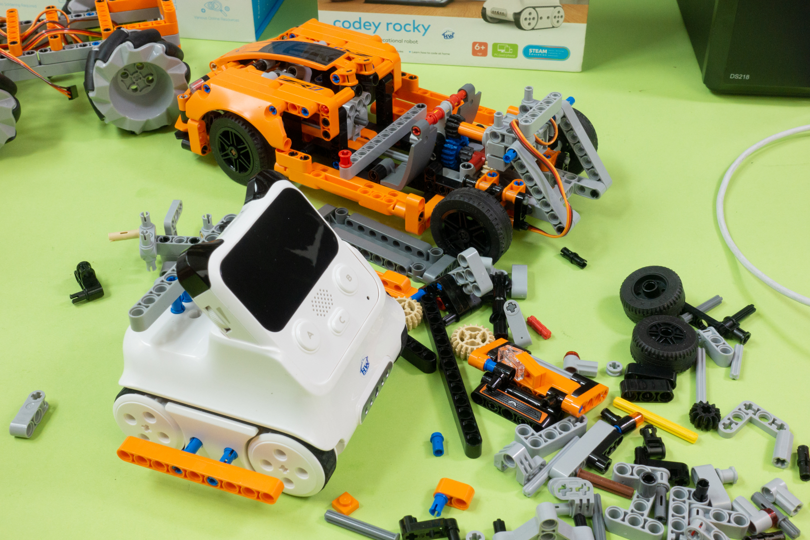 Na zadnej plošine zhora, zozadu aj zboku sú otvory mechanicky kompatibilné so spojovacími prvkami stavebnice LEGO Technic, takže na Codey Rocky môžete postaviť ľubovoľnú nadstvbu. Aj v osiach kolies sú otvory pre hriadele zo stavebnice LEGO Technic.