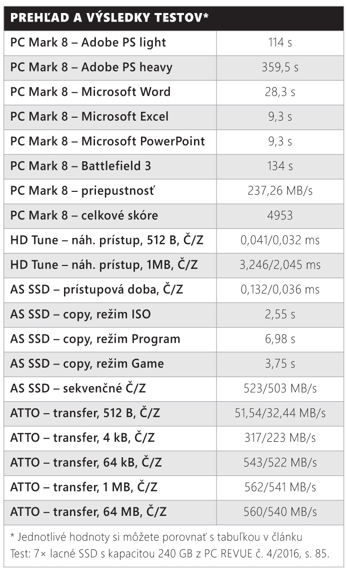 Dôležité je, že rýchlosť nepretržitého sekvenčného zápisu veľmi veľkých súborov je konštantná, neprepadáva sa, v priemere sme namerali výborných 540 MB/s. Pri menších blokoch (427 – 1235 kB), typicky obrázkoch a menších zvukových súboroch, sa drží na 500 MB/s. Slabší je až sekvenčný zápis veľmi malých blokov (12 – 59 kB) reprezentujúcich textové a tabuľkové dokumenty, ktoré sa v kancelárskom prostredí presúvajú najčastejšie, čo je trochu škoda. Zápis 15 MB/s síce nijako neoslní, ale nejde ani o kritickú hodnotu, úplne spokojní by sme však boli s rýchlosťou vyššou asi o tretinu. Výkon náhodného čítania blokov s dĺžkou 512 B (~ 24 000 IOPS) a 4 kB (~ 18 000 IOPS) je už skvelý a práve od neho sa odvíjajú reakčné časy operačného systému. Nejde teda iba o spoľahlivé, ale i veľmi rýchle SSD. Zahrievanie je pritom minimálne, zásluhu na tom má aj kovový obal.