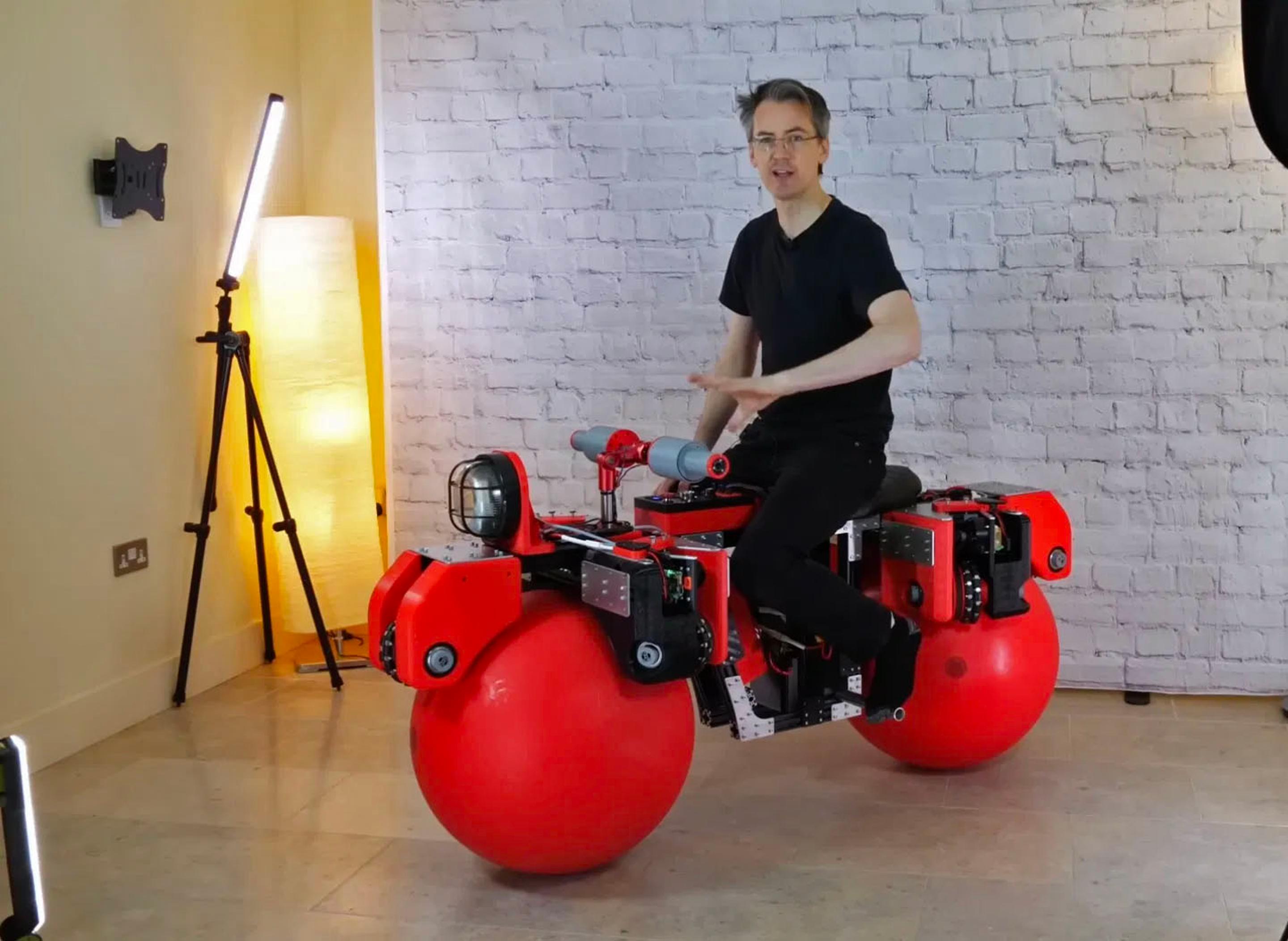 James Bruton je sériový vynálezca bláznivých výmyslov, možno najbizarnejší z nich je samovyvažovací elektrobicykel s veľkými červenými guľami namiesto kolies a piatimi motormi, ktoré ho poháňajú. Nejde o prvé samovyvažovacie zariadenie, ktoré vytvoril Bruton, ale toto je prvýkrát, čo používa ako kolesá rovnovážne gule. Vyzerajú ako lopty na jogu, ale sú tvrdšie a pri zaťažení si zachovajú svoj tvar.