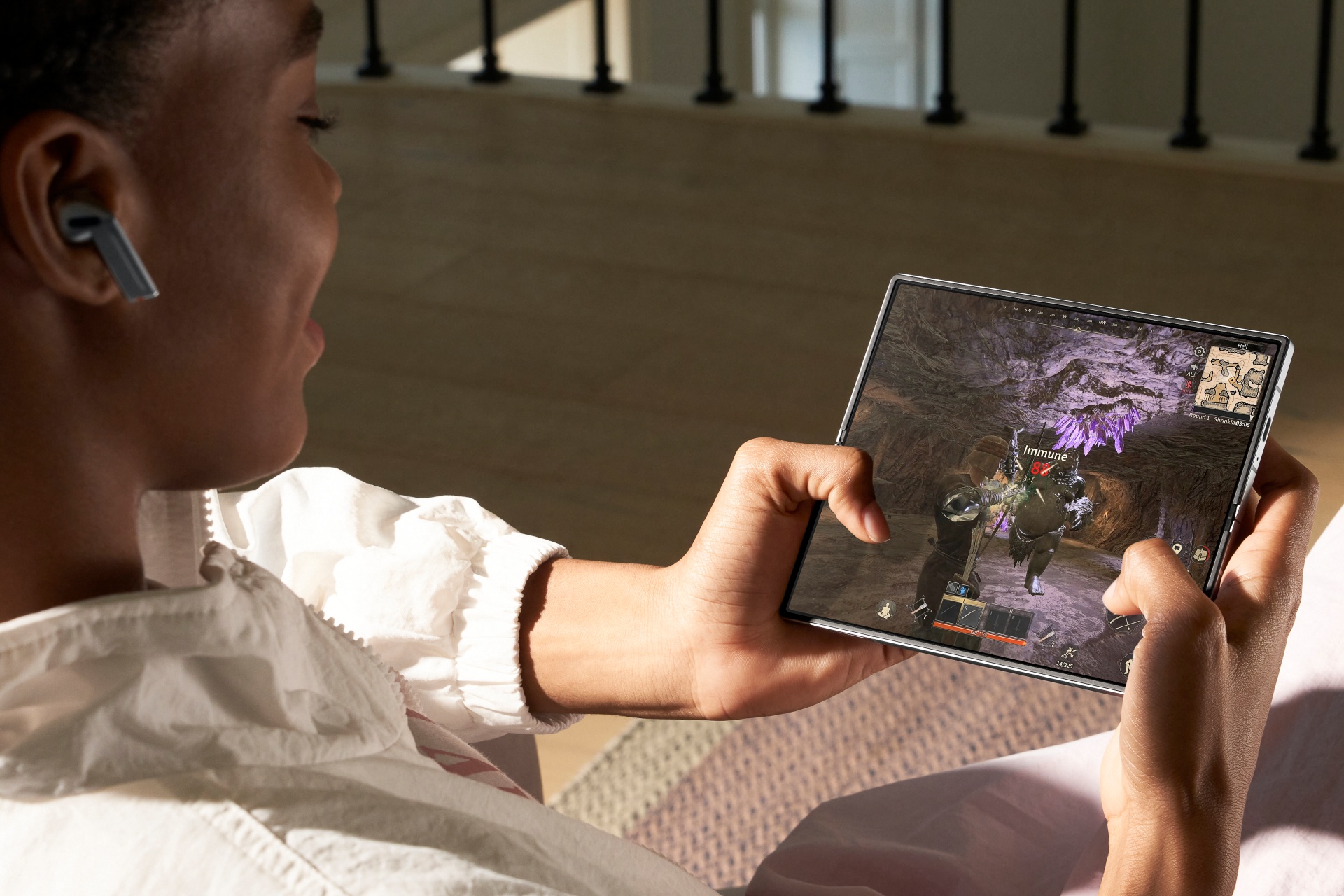 Na Galaxy Z Fold6 môžete obsah nielen vytvárať, ale si ho aj viac užívať. Tento smartfón ponúka lepšie herné zážitky vďaka výkonnej čipovej sade a 1,6× väčšej odparovacej komore, aby ste sa mohli hrať dlhšie pri zachovaní maximálneho výkonu. Živá realistická grafika je podporovaná technológiou Ray Tracing na 7,6" displeji, ktorý ponúka obraz s jasom až 2600 nitov pre dokonalé ponorenie sa do herného sveta.