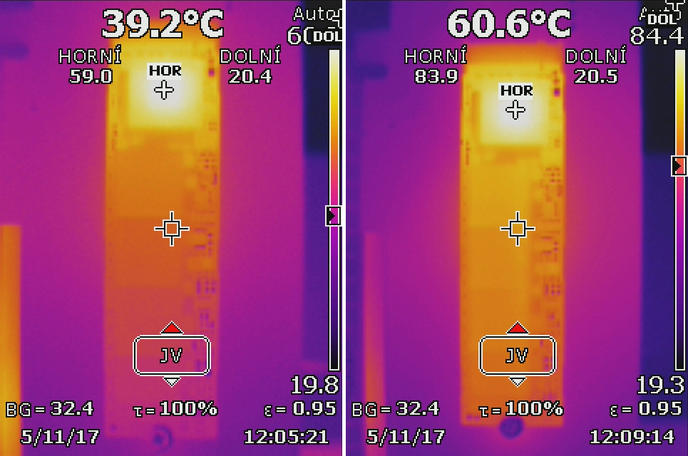 Zahrievanie pri bežnej záťaži (vľavo) a pri maximálnom výkone (vpravo)