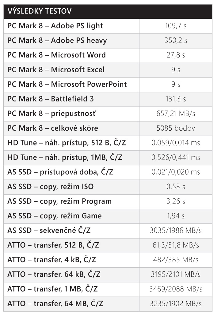 Vlastnosťou OCZ RevoDrive 400 je zase priebeh IOPS s obrovskými skokmi, respektíve pravidelnými výkyvmi. Ten je však už cenou na úrovni Samsung 960 Pro, ktorý sme podrobili detailnému testovaniu. Sumár výsledkov z bežne dostupných benchmarkov, s ktorými môžete doma porovnať i vaše SSD, prikladáme štandardne v tabuľke. Hodnotiť však budeme podľa praktických testov. Po dráhe RAM disk ↔ SSD sme prenášali rôzne veľké súbory – od najmenších cez stále pomerne malé, väčšie až po veľké niekoľkogigabajtové súbory, pri ktorých je výkon SSD najvyšší. Rýchlosť sekvenčného čítania je v priemere 1,8 GB/s a zápisu 1,5 GB/s, čo je až dvakrát viac, než ponúka konkurenčný OCZ RD 400. Výkon je to mimoriadne vysoký a SSD sa pri ňom celkom zapotí, pomocou termovízie sme z povrchu radiča odčítali až 84 °C. Možno by stálo za úvahu pouvažovať o nejakom elegantnom chladiči. Dobrá správa však je, že vysoké zahrievanie nemá vplyv na výkon (ako je to so životnosťou, to je už otázne), ten je stále viac-menej konštantný bez ohľadu na dĺžku trvania prenosu a objem prenášaných dát.