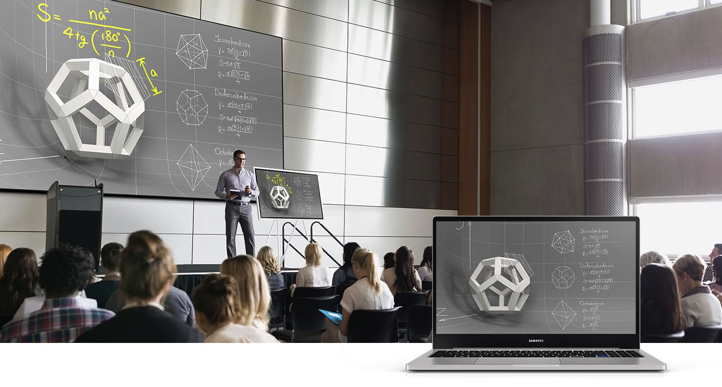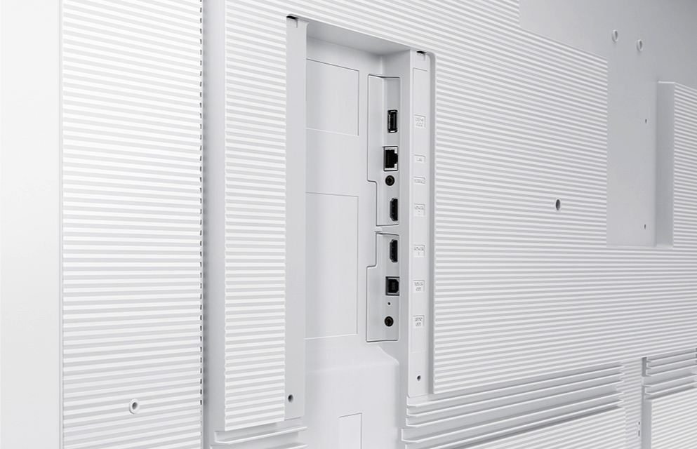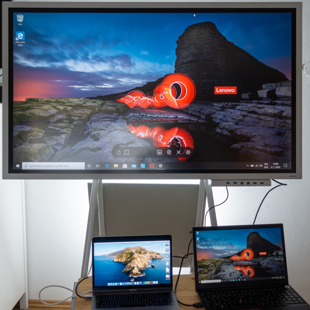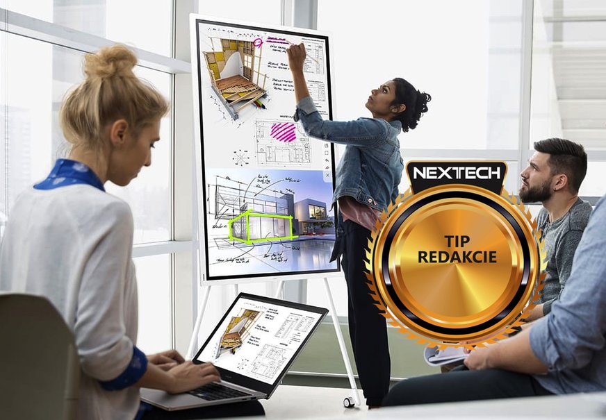 Zobrazovacia časť s 55 palcovou dotykovou obrazovkou s UHD rozlíšením svojou konštrukciou pripomína televízor, alebo veľký monitor. Môžete ho upevniť na stenu, avšak oveľa flexibilnejší je skladací stojan na kolieskach, ktorý umožňuje presun zariadenia z jednej zasadačky, či učebne do inej a hlavne umožňuje preklopiť obrazovku o 90 stupňov, takže môžete napríklad premietať videá v režime na šírku a prezentovať vrátane písania a kreslenia v režime na výšku