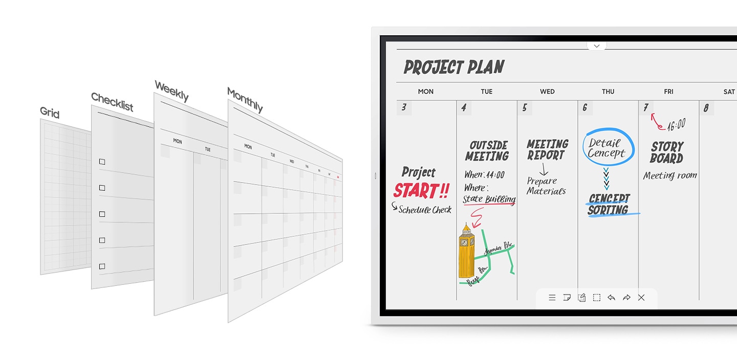 Organizovanie obsahu interaktívnej tabule taktiež vychádza z klasického papierového flipchartu, na ktorom prezentujúci, alebo členovia tímu postupne popíšu a pokreslia niekoľko stránok a tie potom podľa potreby prevracajú, prípadne použijú novú stránku. Samsung Flip 2 má obsah organizovaný ako takzvané virtuálne rolky, ktoré môže maž až 20 stránok. Na jednotlivých stránkach môžete realizovať svoje textové a grafické výtvory a jednoducho medzi nimi prechádzať. Využívať môžete aj šablóny usporiadania objektov na stránkach rolky. Môžete použiť šablónu typu kalendár, plánovač alebo tabuľu na poznámky či zoznam úloh.