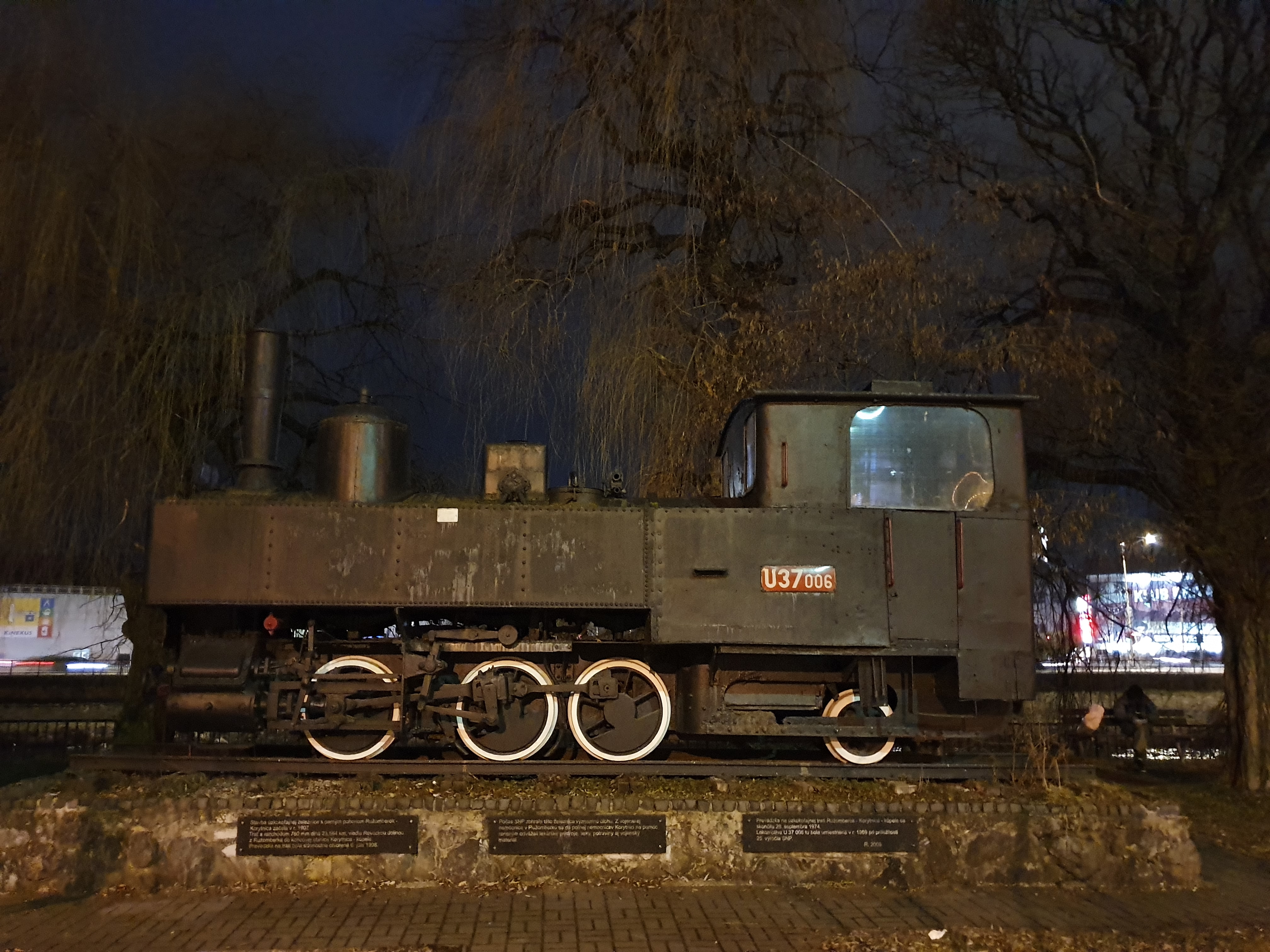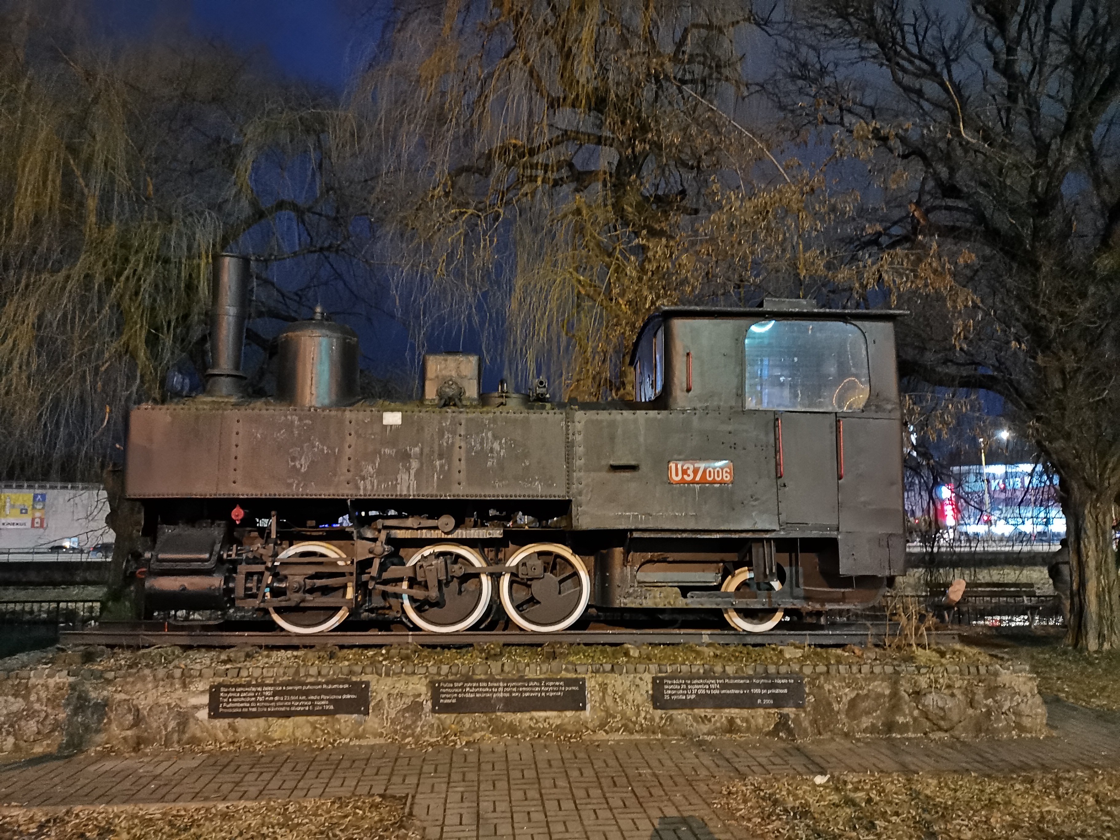 Ešte reálny nočný záber parnej lokomotívy pri pouličnom osvetlení.